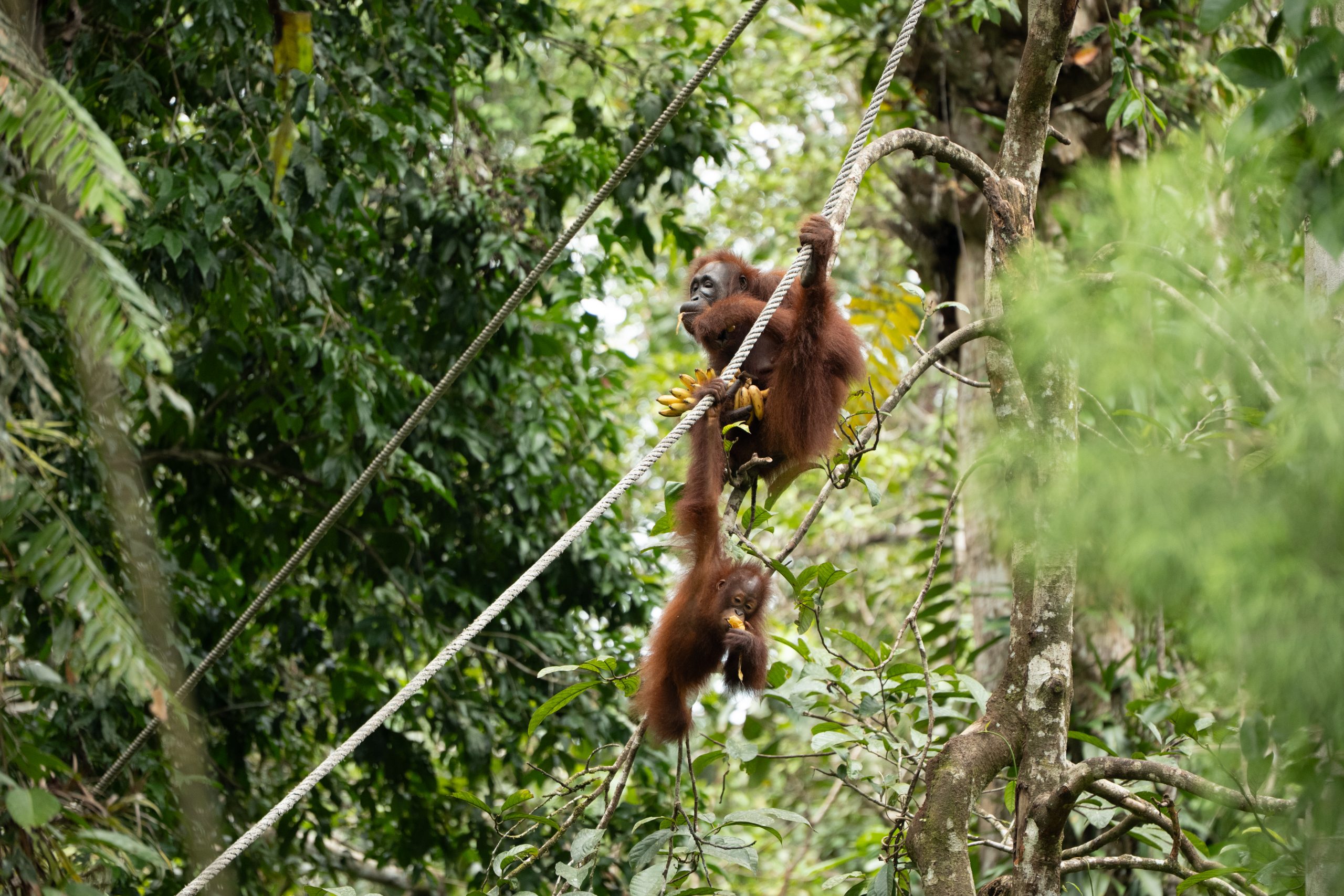 Überpünktlich – eine halbe Stunde vor Beginn der Fütterung – erreichen wir die Plattform. Schnell erkennen wir, dass sich andere Besucher bereits aufgeregt, aber erfreulich leise, entlang des Sicherheitsgeländers verteilt haben. Und tatsächlich: Einige Orang-Utans haben sich schon eingefunden und warten gierig auf ihre Bananen!