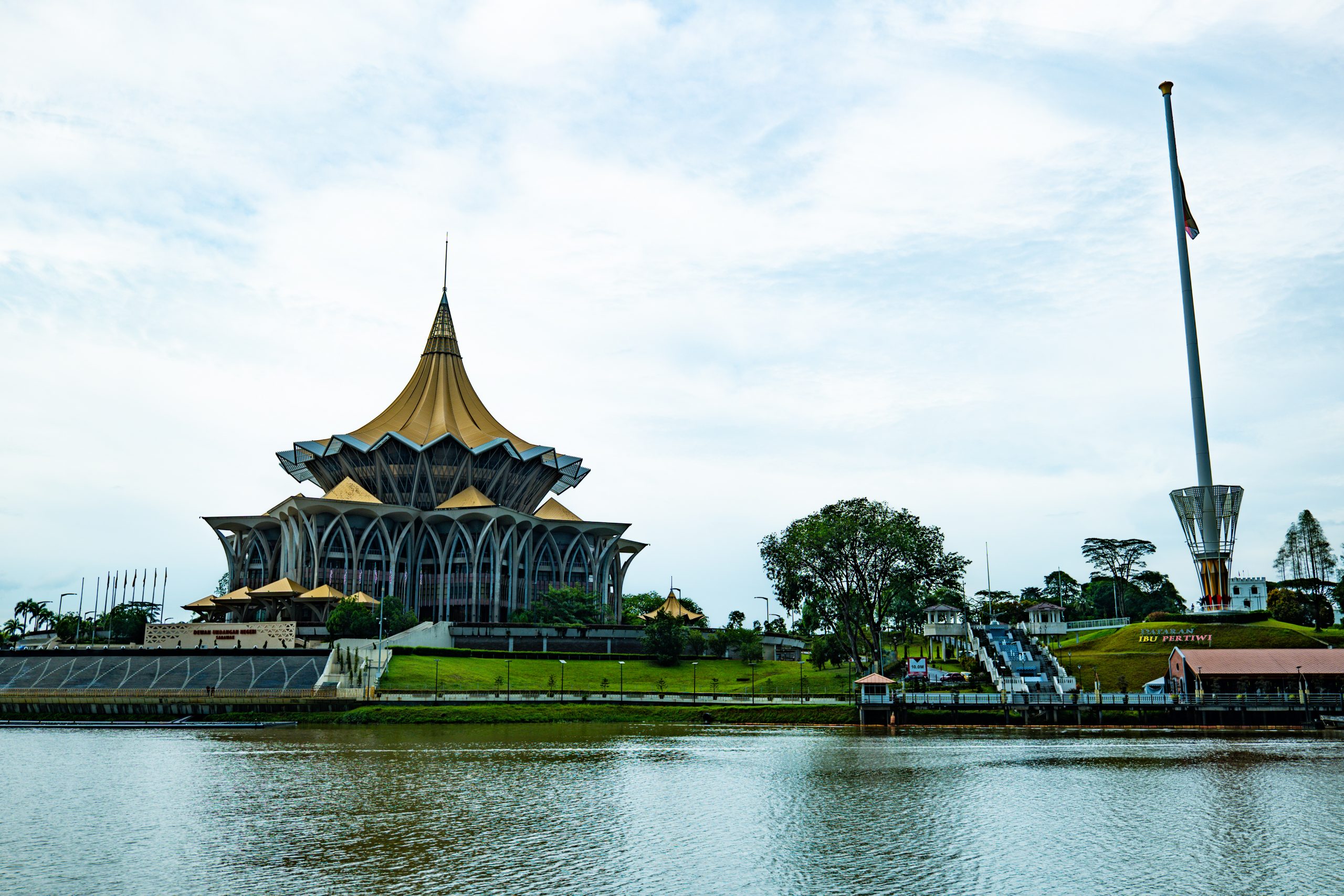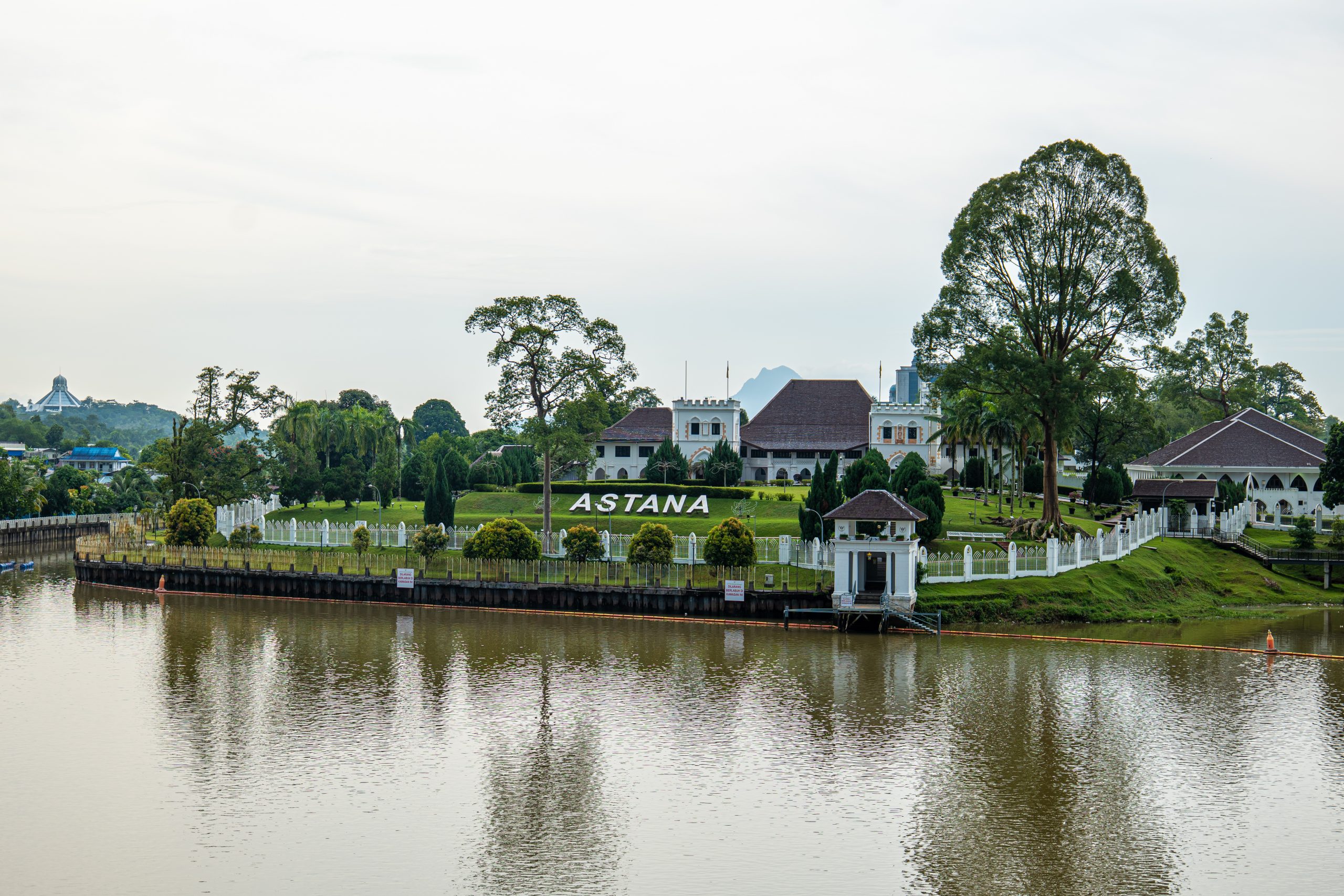 Unser Hotel liegt direkt am Ufer des Sarawak-Flusses, zentral im Bereich der sogenannten „Kuching Waterfront“ – jenem Viertel, das nachts in hellem Licht erstrahlt. Die Waterfront erstreckt sich malerisch entlang des Flusses und bildet das pulsierende Herz der Stadt. Auf der gegenüberliegenden Seite erhebt sich eindrucksvoll das moderne Regierungsgebäude mit seiner goldenen Kuppel, gleich daneben die historische Astana – einst Residenz der Weißen Rajahs, der Regentenfamilie der Brooke-Dynastie, die das Königreich Sarawak von 1841 bis 1946 regierte.