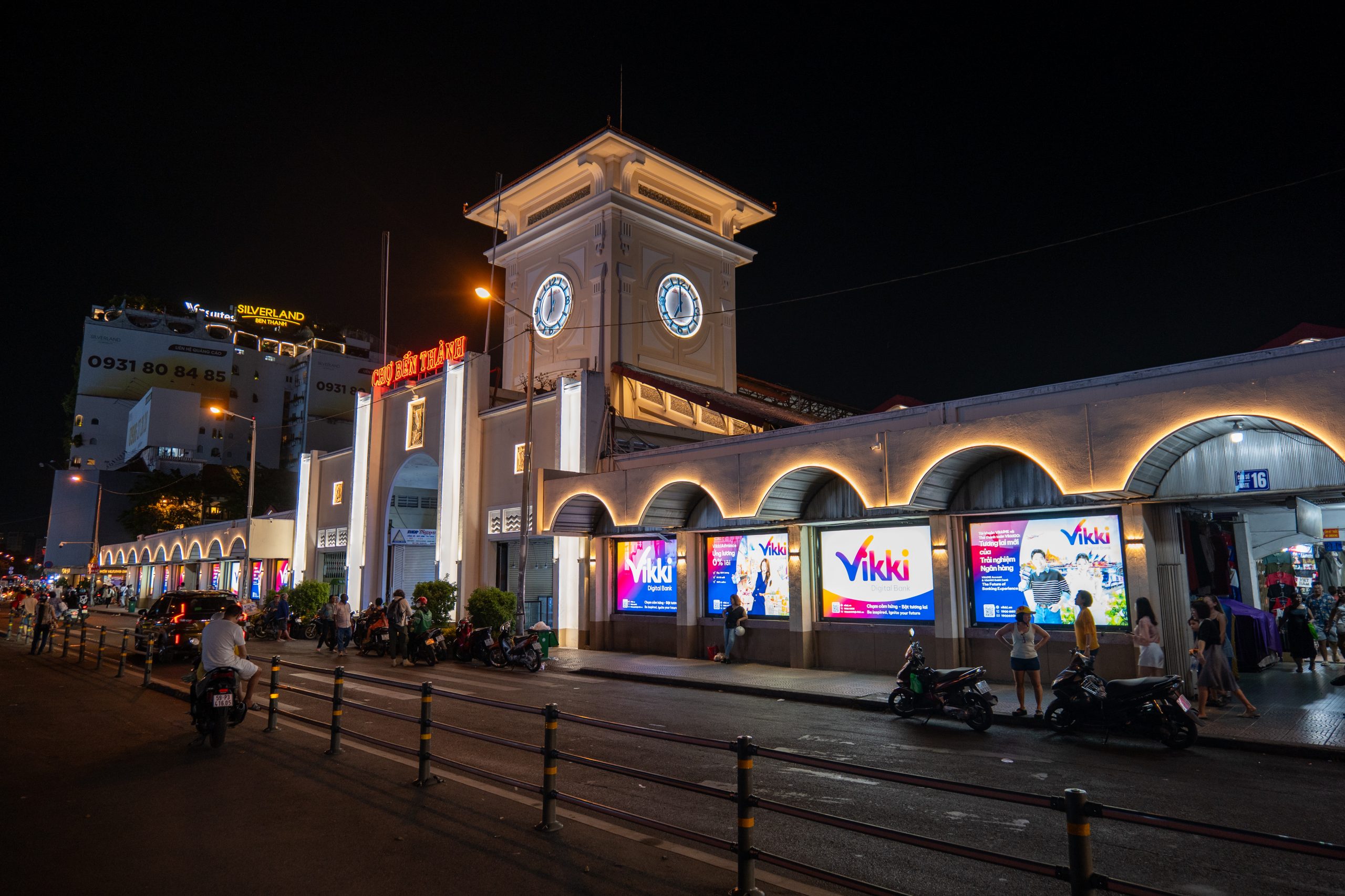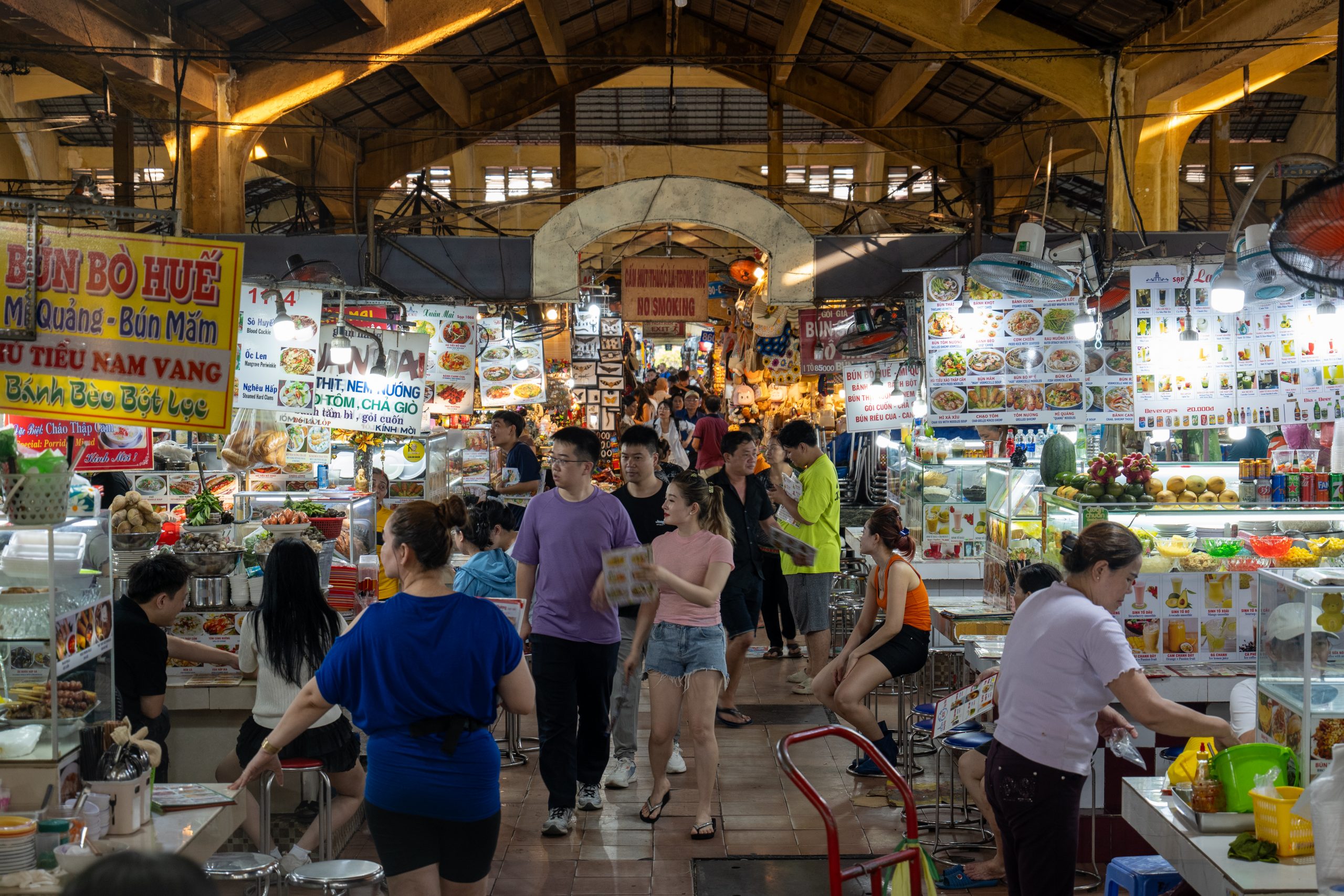 Im Stadtzentrum besuchen wir zunächst den Ben-Thanh-Markt im Herzen der Stadt, der zugleich das Ende der Metro-Linie markiert. Angeblich ist dieser Markt ein absolutes Muss für jeden Saigon-Besucher: Seit 1912 lockt er mit seinem ikonischen Uhrturm und über 1.500 Ständen voller frischer Lebensmittel, Gewürze, Kleidung und Souvenirs. Tagsüber pulsiert er vor Leben – Händler preisen lautstark ihre Waren an, während der Duft von Pho und Banh Mi durch die Gänge zieht. Auch hier fühlen wir uns allerdings nicht wirklich wohl: Im Gegensatz zu anderen Markthallen, die wir besucht haben, sind die Händler hier aufdringlich und laut. Kein Stand, an dem man vorbeigeht, ohne dass einem die Speisekarte fast ins Gesicht gehalten wird, kein Verkäufer, der nicht lautstark versucht, Seidenschals oder Kaffee an den Mann zu bringen.