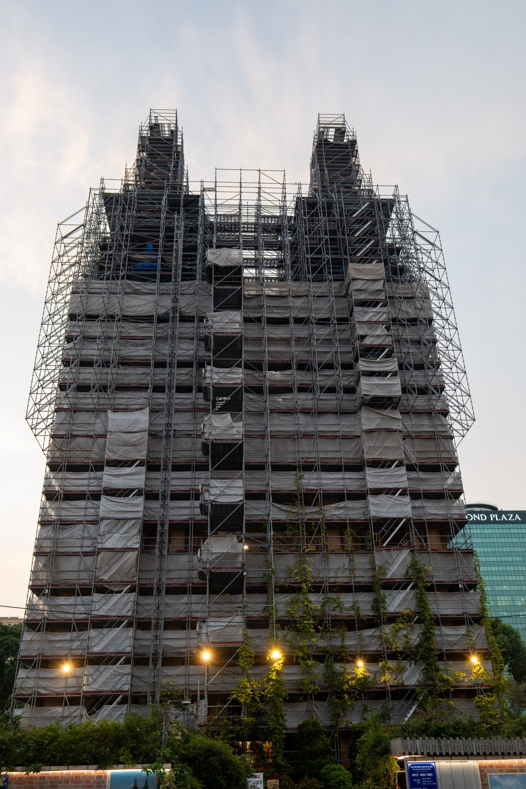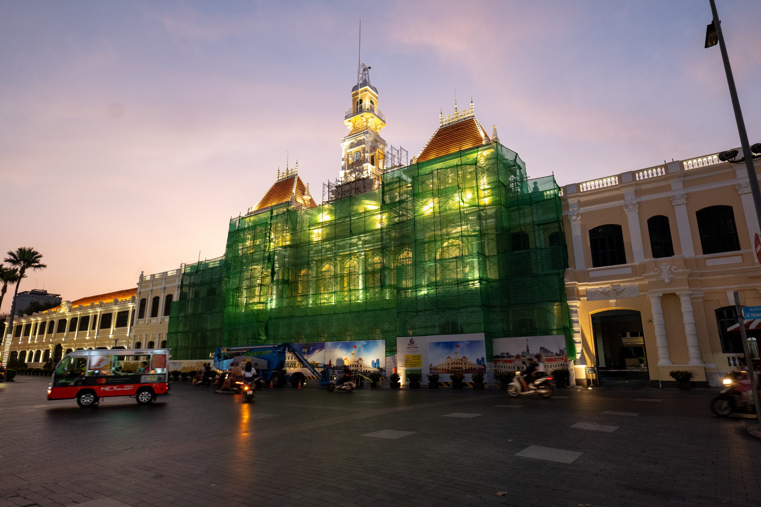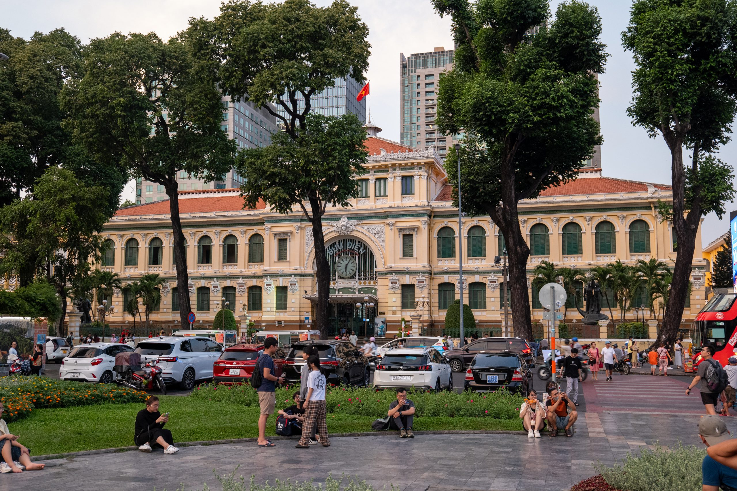 Wir schlendern weiter in Richtung der Saigoner Notre-Dame-Kathedrale, die jedoch derzeit vollständig eingerüstet ist, da sie renoviert wird. Gegenüber befindet sich das zentrale Postamt Saigons – ein historisches Gebäude, das um 1890 in einer Mischung aus gotischen, Renaissance- und französischen Architekturstilen erbaut wurde. Fälschlicherweise wird der Bau häufig Gustave Eiffel zugeschrieben, tatsächlich stammt der Entwurf jedoch vom französischen Architekten Foulhoux.