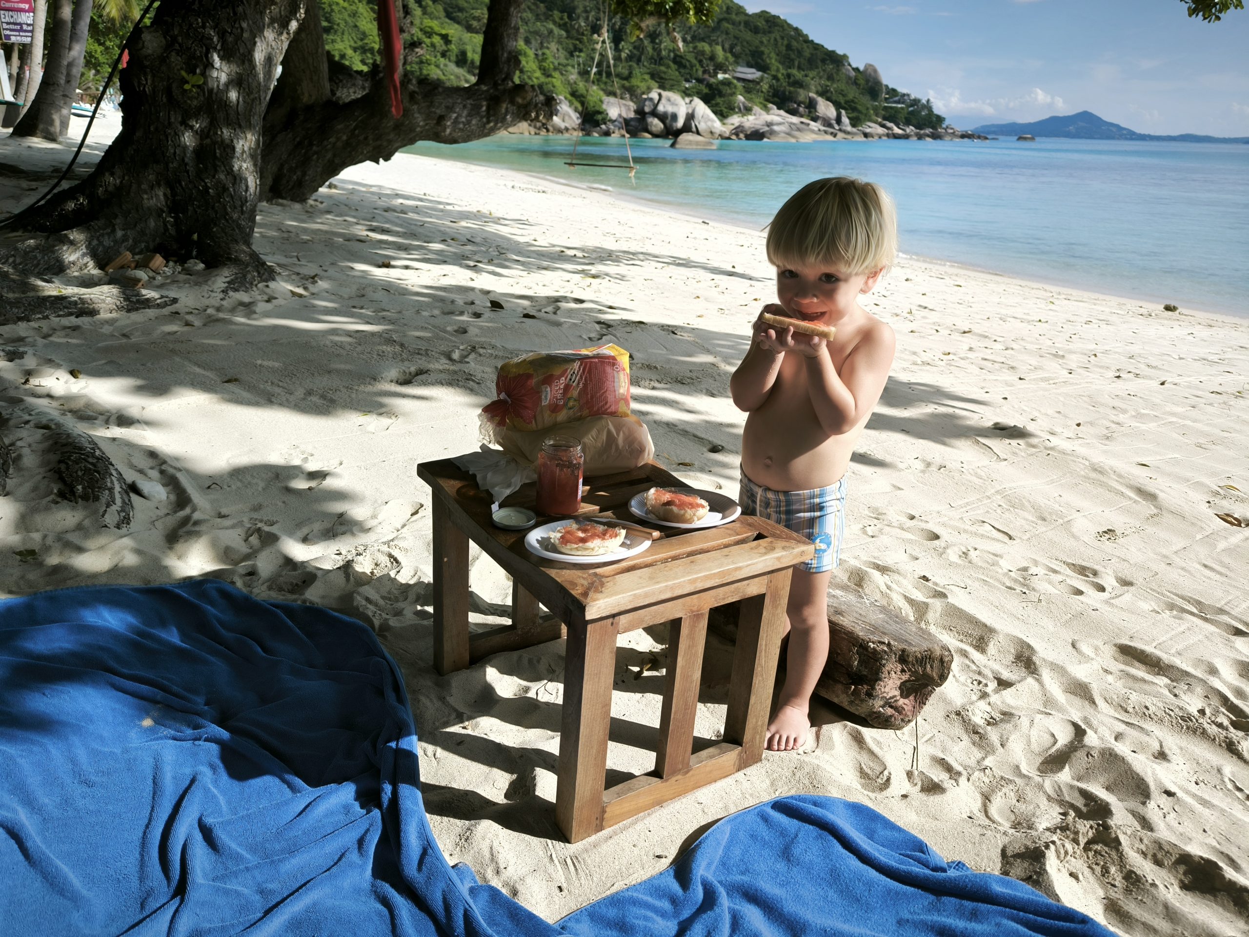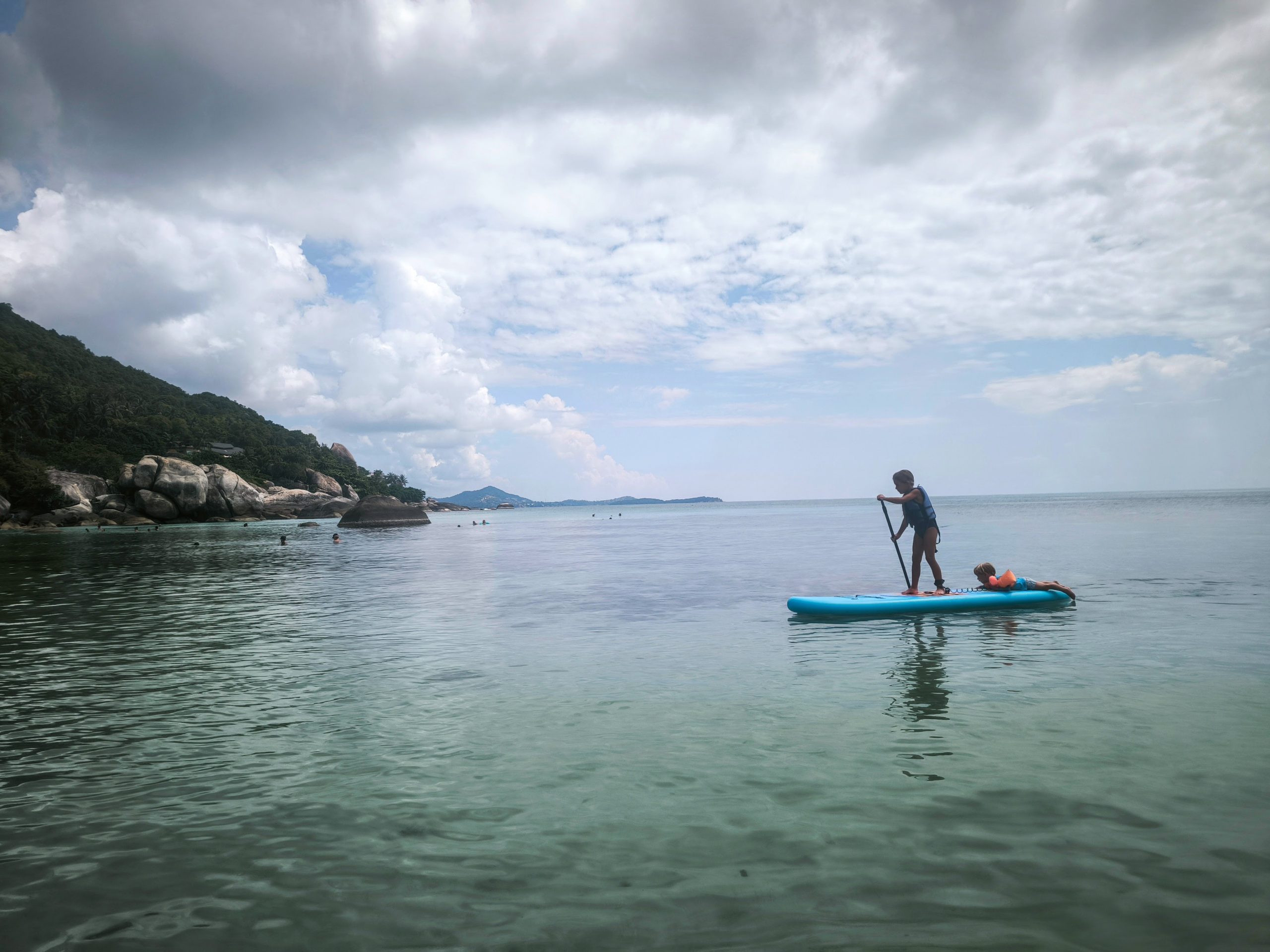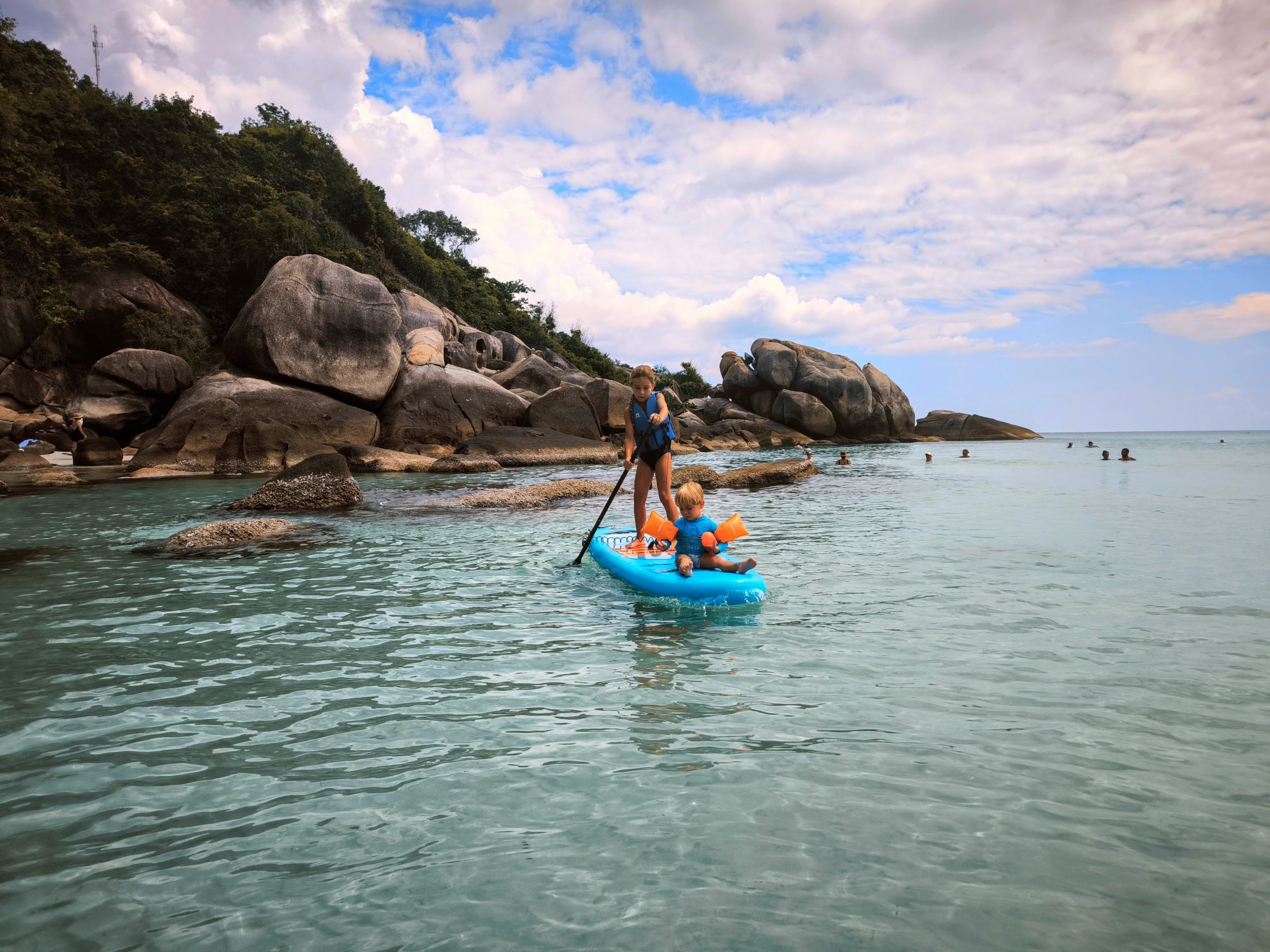 Während einer von uns tauchen ist, kümmert sich derdie andere um die Kinder. In meiner Abwesenheit mietet Antje ein Stand-Up-Paddleboard, und schon kurze Zeit später schießt Nele mit Ian durch die Bucht, als sei der weiße Hai persönlich hinter ihnen her. Während Antjes Tauchgang unternehmen wir einen Ausflug zum Na-Muang-Wasserfall. Ich erinnere mich noch vom letzten Besuch: Hier kann man nicht nur am Fuß des Wasserfalls baden, sondern davor auch ein paar Elefanten füttern.