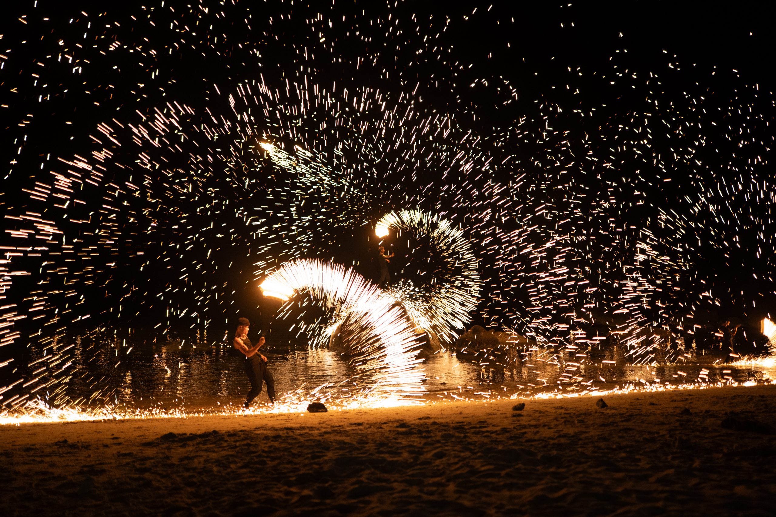 Auch sonst finden wir in unserem Hotel und in der Umgebung alles, was wir für den Anfang brauchen: Das Meer ist fantastisch – warm, flach und voller Fische. An einigen Abenden tritt eine Feuershow-Truppe am Strand auf, die sich hier richtig ins Zeug legt – es ist die eindrucksvollste Show dieser Art, die wir bisher auf der Reise gesehen haben.