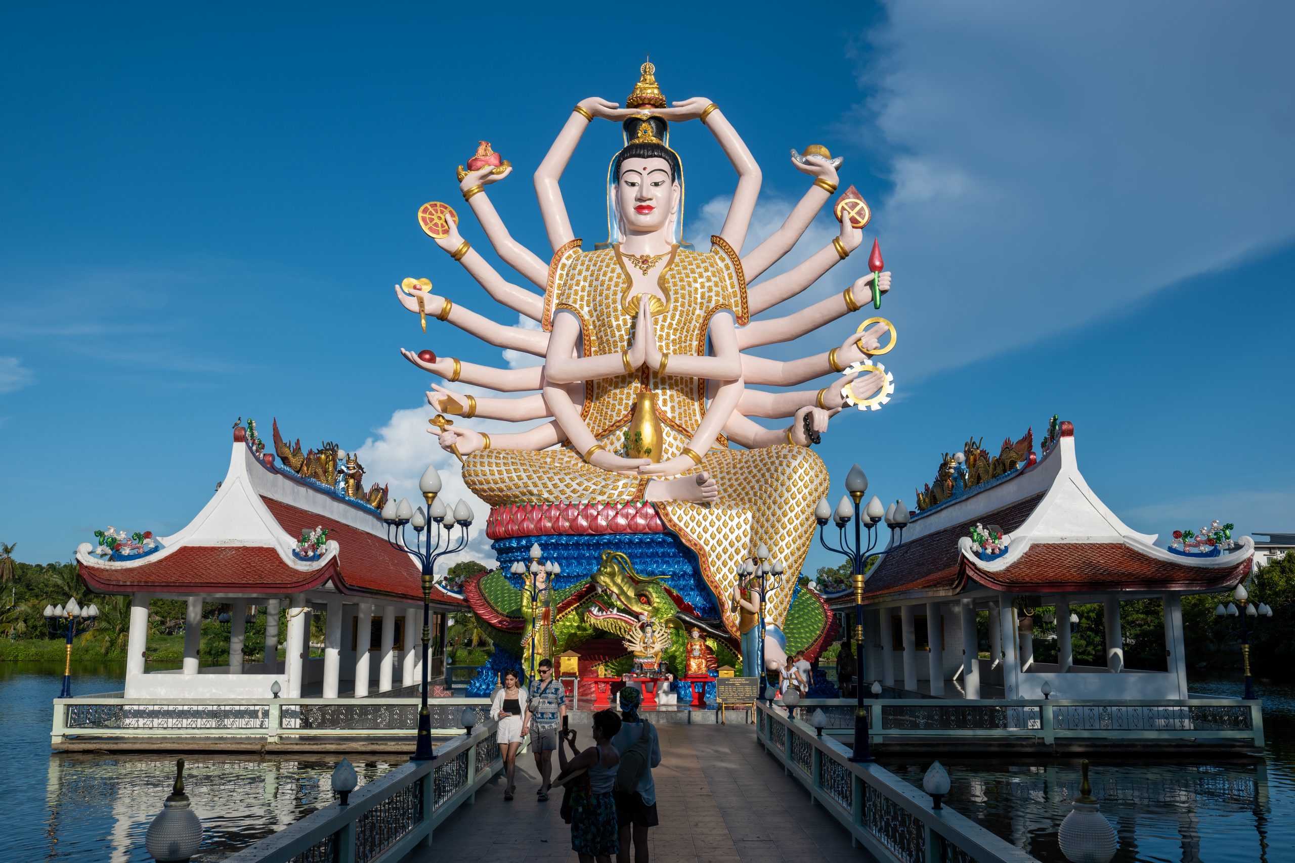 Der einzige größere Ausflug, den wir gemeinsam unternehmen, führt uns zur Tempelanlage von Wat Plai Laem im Norden der Insel – ein farbenfroher Komplex, der moderne buddhistische Architektur mit chinesischen Einflüssen vereint. Im Zentrum thront eine monumentale Statue der Guanyin mit 18 Armen, umgeben von kunstvoll gestalteten Figuren und Schreinen. Trotz des regen Besucherbetriebs bleibt die Anlage ein aktives religiöses Zentrum, in dem Einheimische beten und Opfergaben darbringen.
