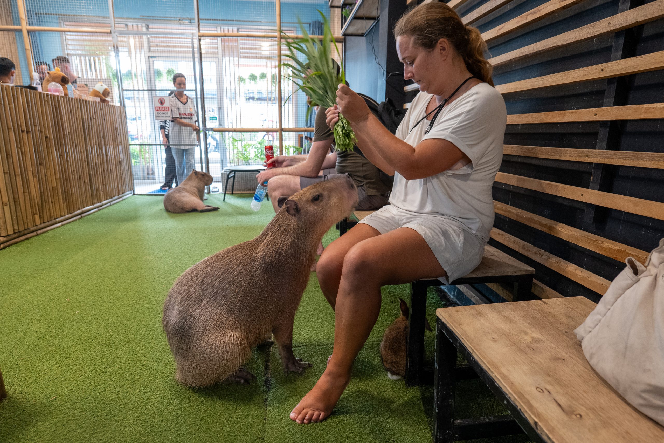 Anschließend besuchen wir ein Capybara-Café – eine skurrile Einrichtung, deren Konzept irgendwo zwischen Zoostreichelgehege und Hipsteridee liegt. Katzen-Cafés kannten wir, aber die Anwesenheit mehrerer, bis zu 30 Kilogramm schwerer Wasserschweine ist dann doch etwas Neues. Die harmlosen Nagetiere, verwandt mit Meerschweinchen, dürfen gefüttert und gestreichelt werden. Die Kinder aber sind sich nicht ganz sicher, was sie von diesen freundlichen Riesen halten sollen – das bislang schwerste dokumentierte Tier brachte schließlich stolze 92 Kilo auf die Waage. Also wenden sie sich lieber dem kleineren „Fußvolk“ zu: Kaninchen, Papageien und andere tierische Statisten wuseln zwischen den Capybaras umher und sorgen für ausreichend Unterhaltung.