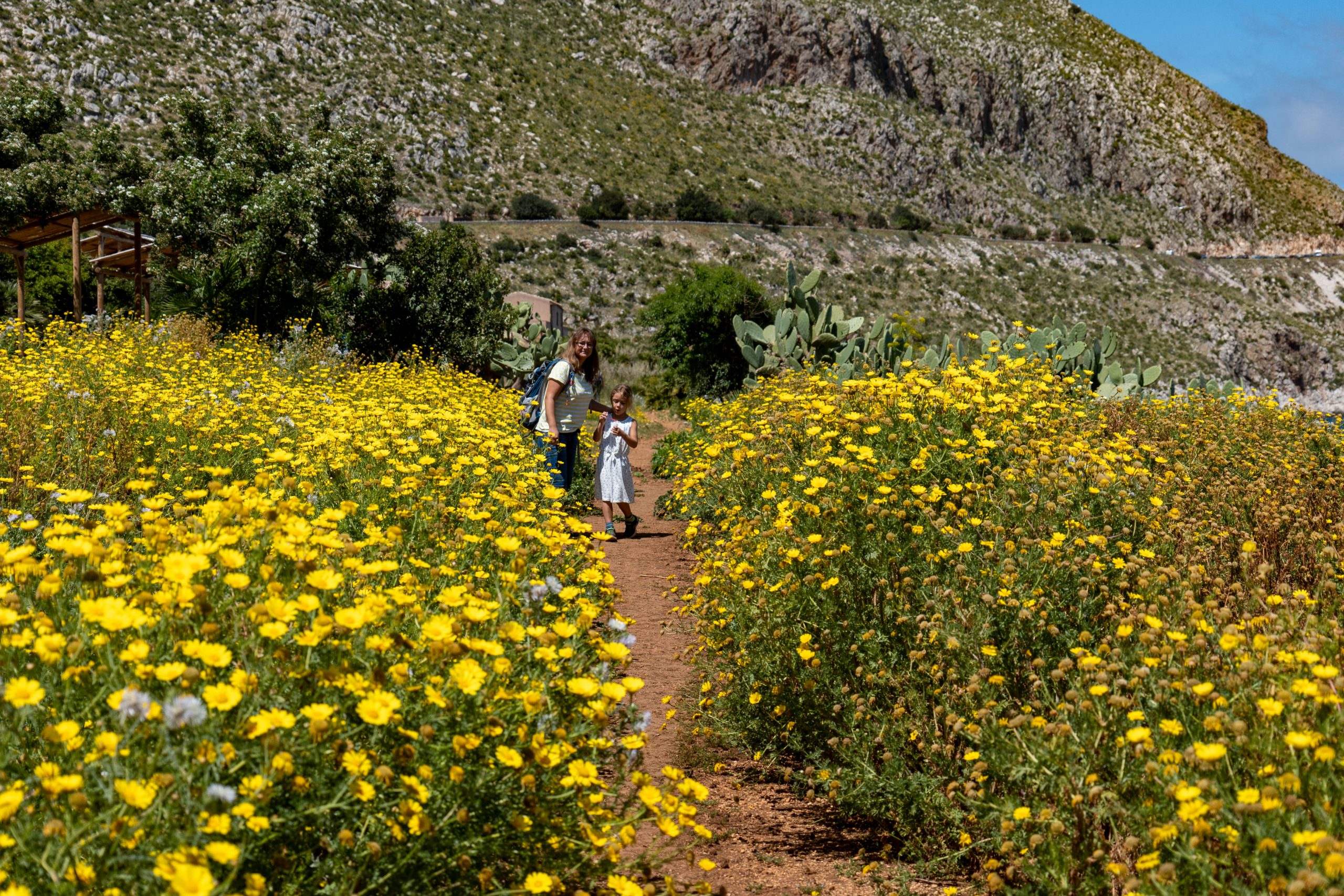 Wir hingegen sind bei 16°C Wassertemperatur eher an einer Wanderung interessiert, und so satteln wir nach einem Abendessen mit wahnsinnig guter Pizza aus dem Holzofen und einer gemütlichen Nacht früh morgens Kraxe und Wohnmobil. Schnell legen wir die 10 Kilometer zum Eingang des Parks zurück, zahlen die 10€ Eintritt und finden uns unverzüglich in einem lila-gelben Blumenmeer wieder. Jetzt im Frühling steht alles in voller Blüte, die Wildbienen summen von Blüte zu Blüte und unter uns rauscht das Meer, dessen Farben irgendwo zwischen türkis und smaragd changieren. Das Nationalreservat zeigt sich bei besten Wandertemperaturen von etwa 22°C und strahlendem Sonnenschein von seiner besten Seite! Wir erwandern uns einige Kilometer, verzichten aber auf den Höhenweg, der mit einer gut und gern 500 Meter hohen Höhenlinie aufwartet. Stattdessen bleiben wir unten auf Meereshöhe und wandern von Bucht zu Bucht. Im Sommer wird es auch hier sicherlich proppenvoll, aber wir finden locker noch ein Plätzchen, um unser kleines Handtuch auszubreiten und ein ganz klein wenig die Füße ins Wasser zu halten.