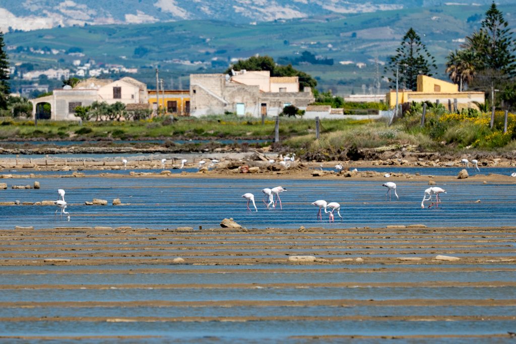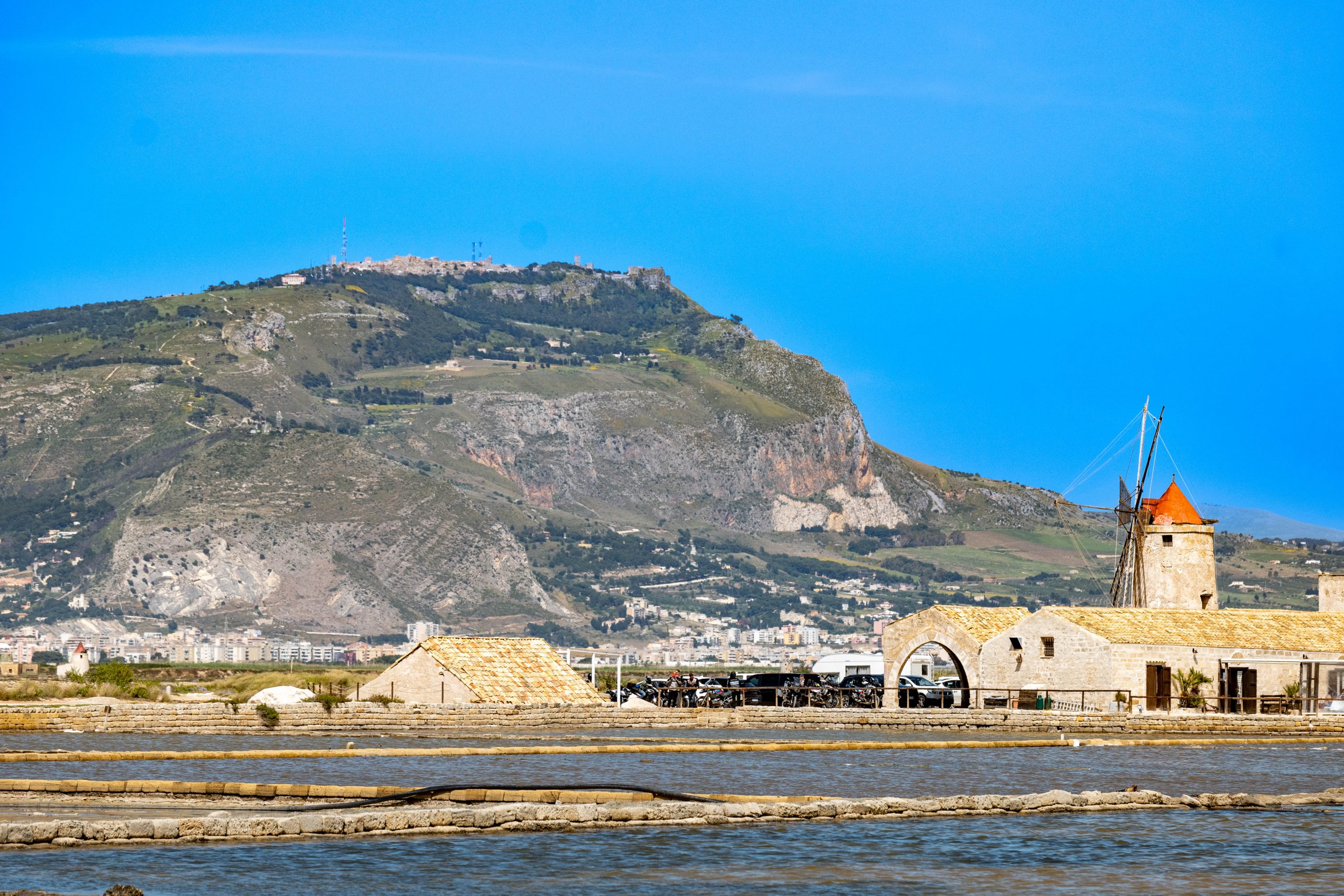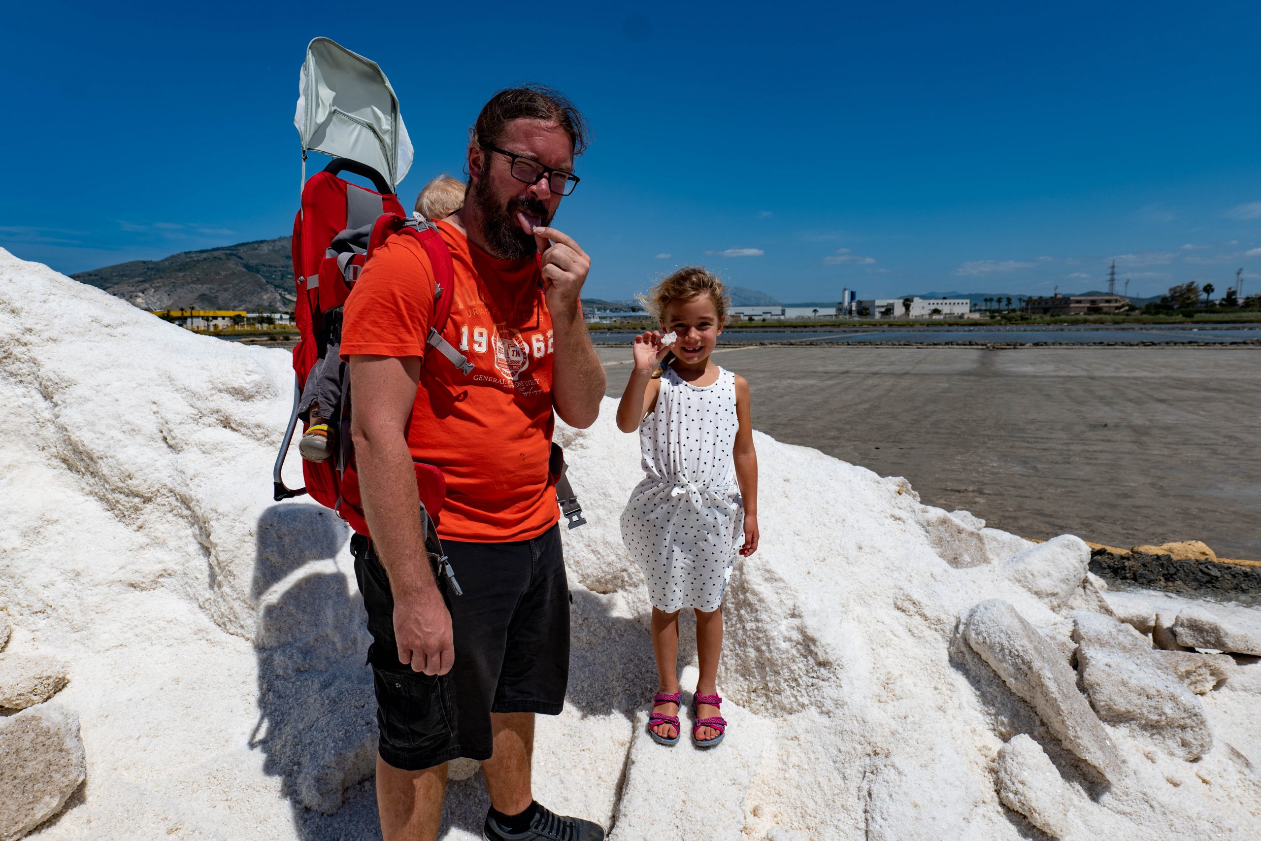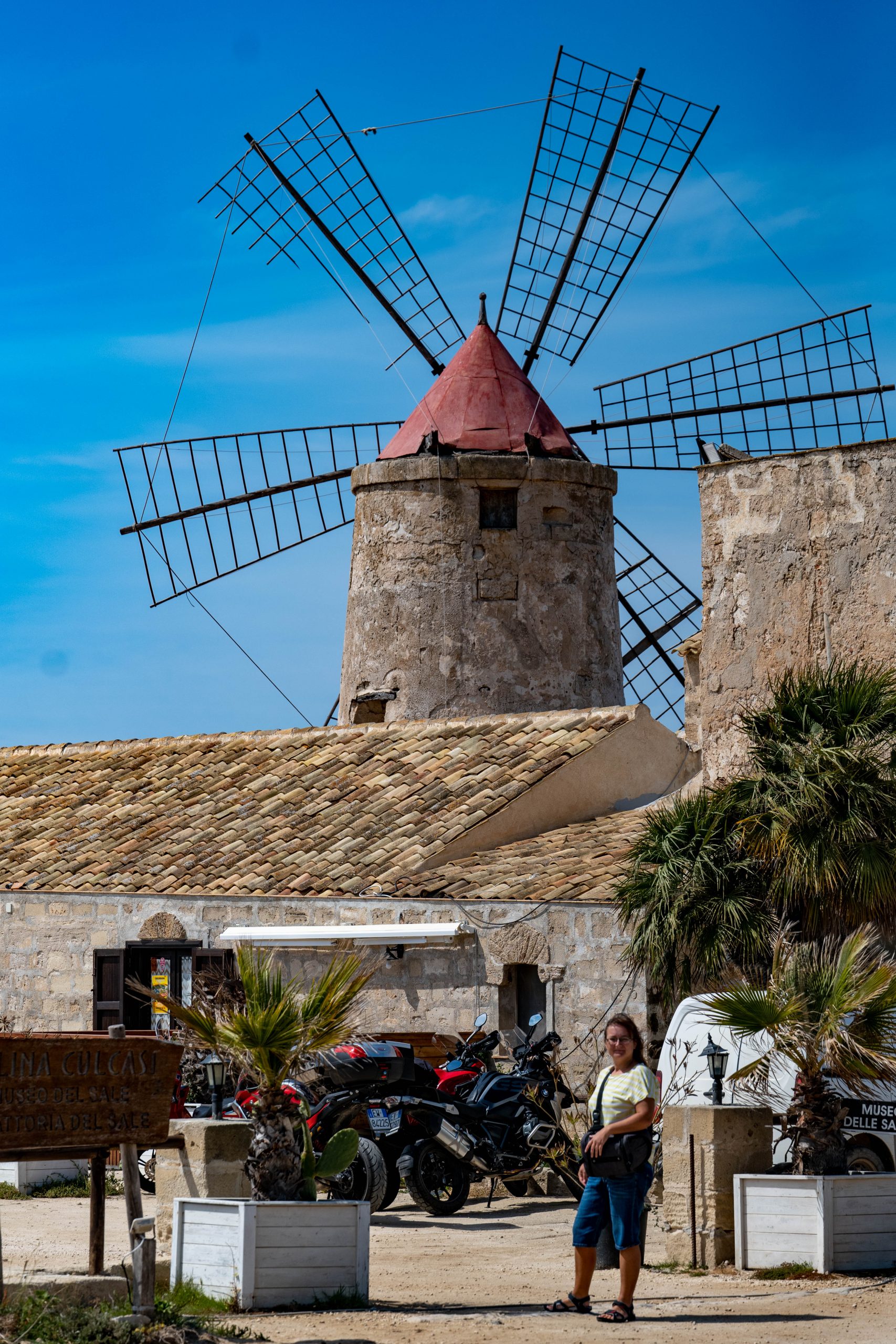 Als erstes steuern wir das örtliche Decathlon-Geschäft an, weil wir in den letzten Wochen mehr als ein paar Schuhe respektive Sandalen kaputtgelaufen haben, und gestern mussten Antjes Wandersandalen dran glauben. Nachdem wir in Sachen Schuhwerk wieder ausgestattet sind, treffen wir eine Entscheidung, und zwar die gegen Erice. Erice ist heute eine Gemeinde mit etwa 27.000 Einwohnern, verfügt aber über ein mittelalterliches Zentrum, welches auf dem Plateau des Monte Erice nordöstlich von Trapani liegt. Der mittelalterliche Kern ist in hervorragendem Erhaltungszustand und ist Unesco-Weltkulturerbe. Eigentlich wäre der Stadtkern auf dem Berg auch für uns problemlos zu erreichen, führt doch eine Seilbahn von Trapani aus in etwa 10 Minuten auf den Berg hoch. Wir verzichten aber aus Zeitgründen auf den Besuch und wenden uns den direkt südlich des Decathlon liegenden Salinen von Trapani zu. Hier in der Region wird auch heute noch auf traditionelle Weise Meersalz gewonnen, indem große Becken, die sogenannten Salzpfannen, nach und nach immer wieder mit Meerwasser geflutet werden und dann vom Meer getrennt werden. Das Wasser in den Pfannen verdunstet, und zurück bleibt, nach ein paar Wiederholungen, feinstes Meersalz.