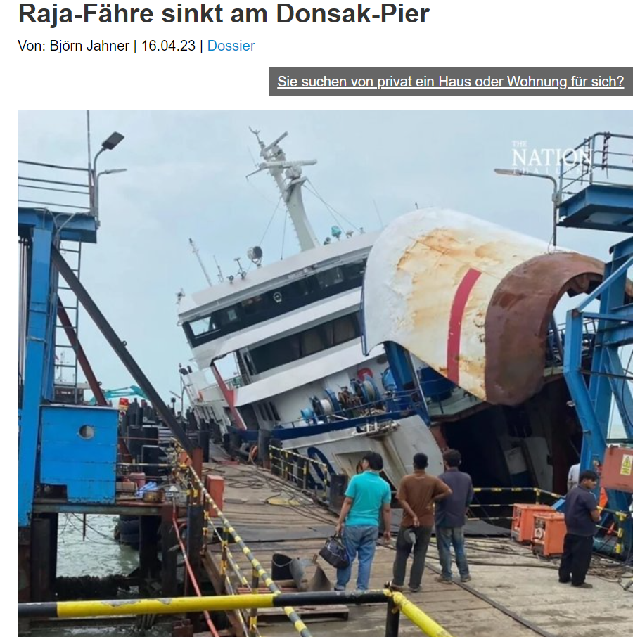 Uns begrüßt die Altstadt zuerst aber mit einem schmutzigen Binnenhafen, in dem wir Nele endlich an plakativen Beispielen den Begriff Seelenverkäufer erklären können… A propos Seelenverkäufer! Wer erinnert sich an meine Gedanken zum Thema „Fähre nach Ko Samui“? Als ich beschrieb, dass ich einen Untergang für unmittelbar bevorstehend hieit? Nun war es so weit, ich weiß aber nicht, ob es genau unsere war. Fährlinie und Pier stimmen auf jeden Fall…