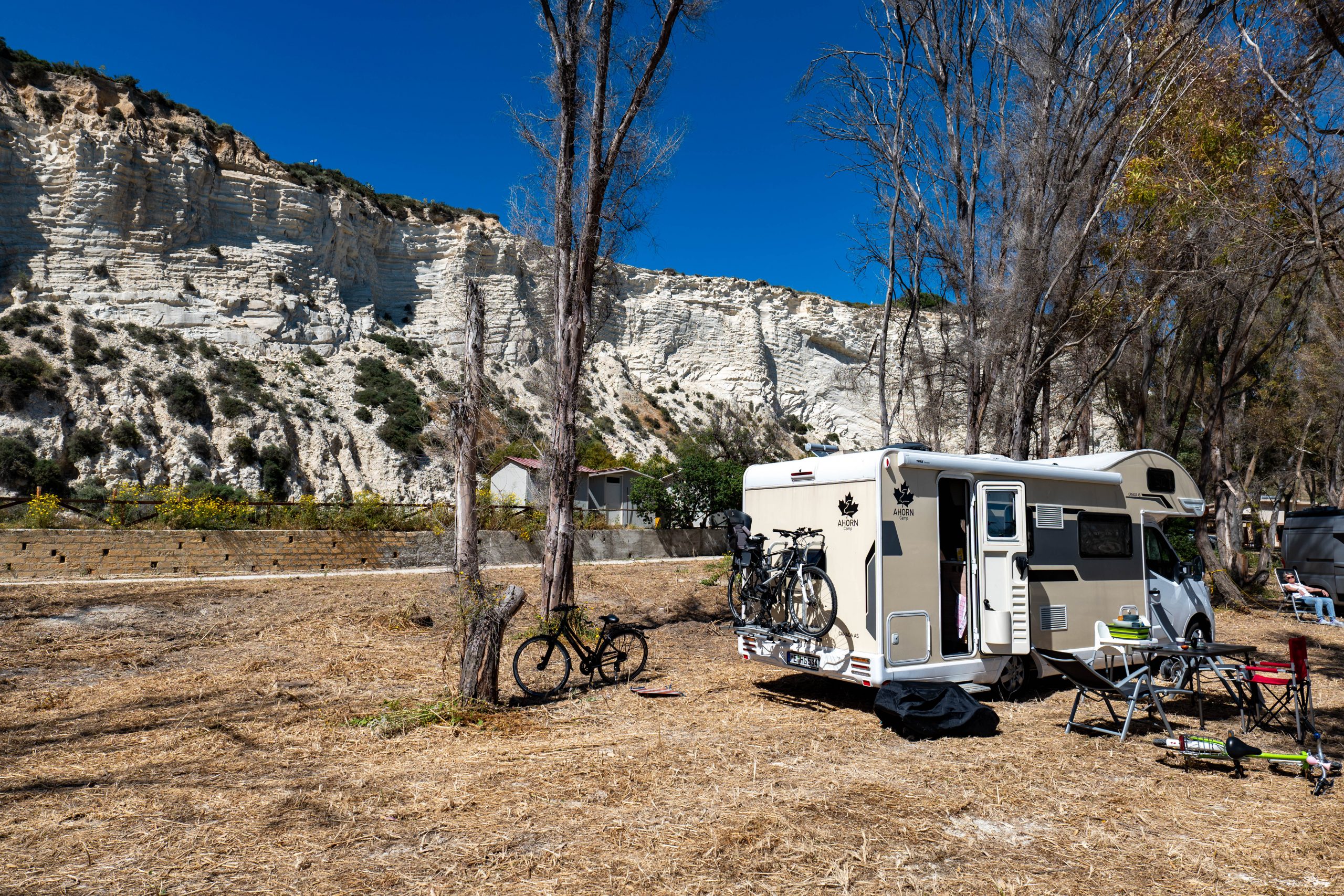 Der Campingplatz am Capo Bianco hat neben seiner Eigenschaft, der teuerste von allen zu sein, keine weiteren Reize – insgesamt ist die Stimmung auch eher frostig. Man kann das nicht genau erklären, aber allein das Verhalten der Mitarbeiter, die die Gespräche beenden, wenn man den Minimarkt betritt, lässt ein unangenehmes Gefühl zurück – auch, wenn natürlich nicht ich der Grund für die schlechte Stimmung bin. Irgendwas ist bei den Betreibern im Busch, da bin ich mir sicher. Kurz: Es ist keine schöne Stimmung, und wir verlassen das Capo Bianco.