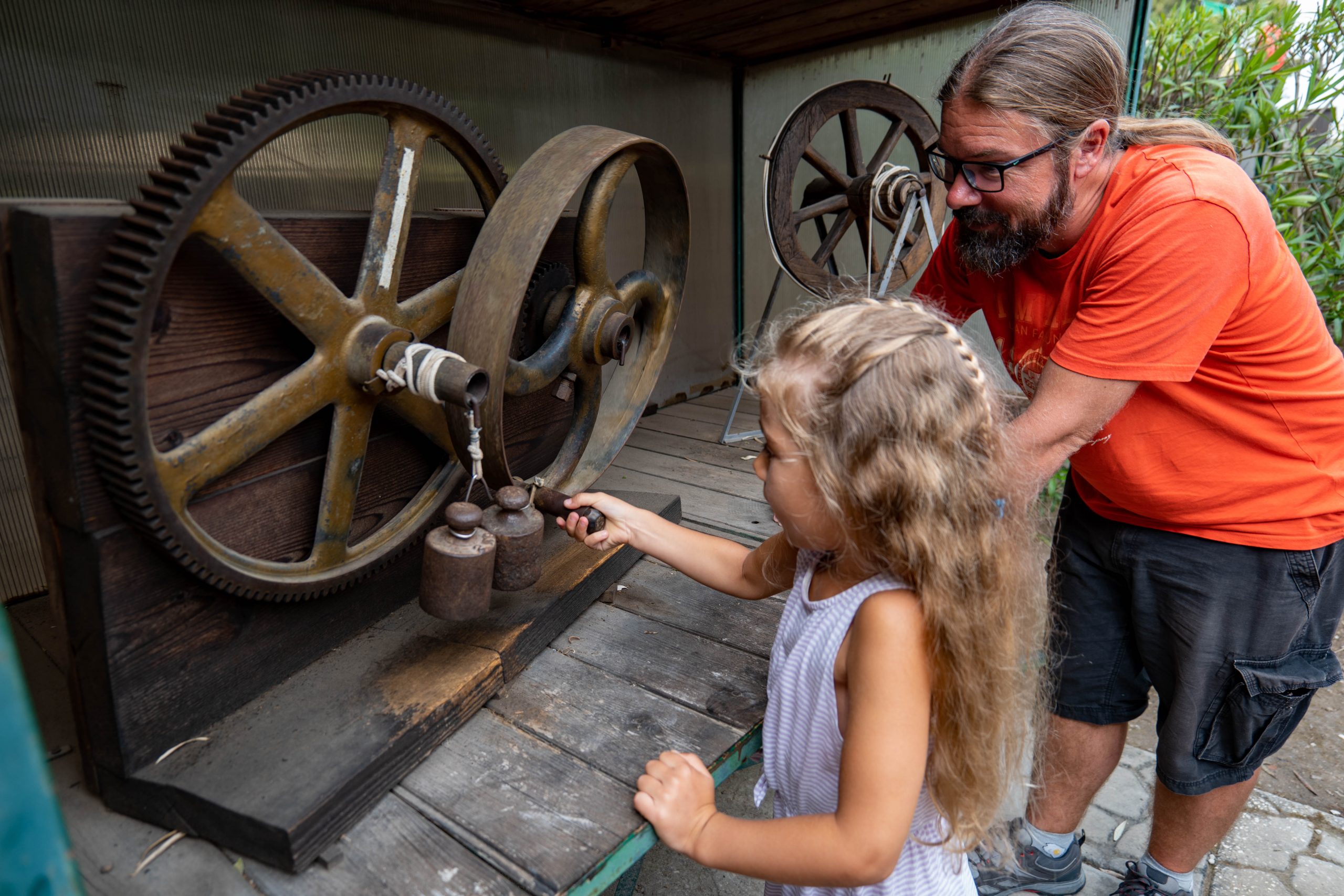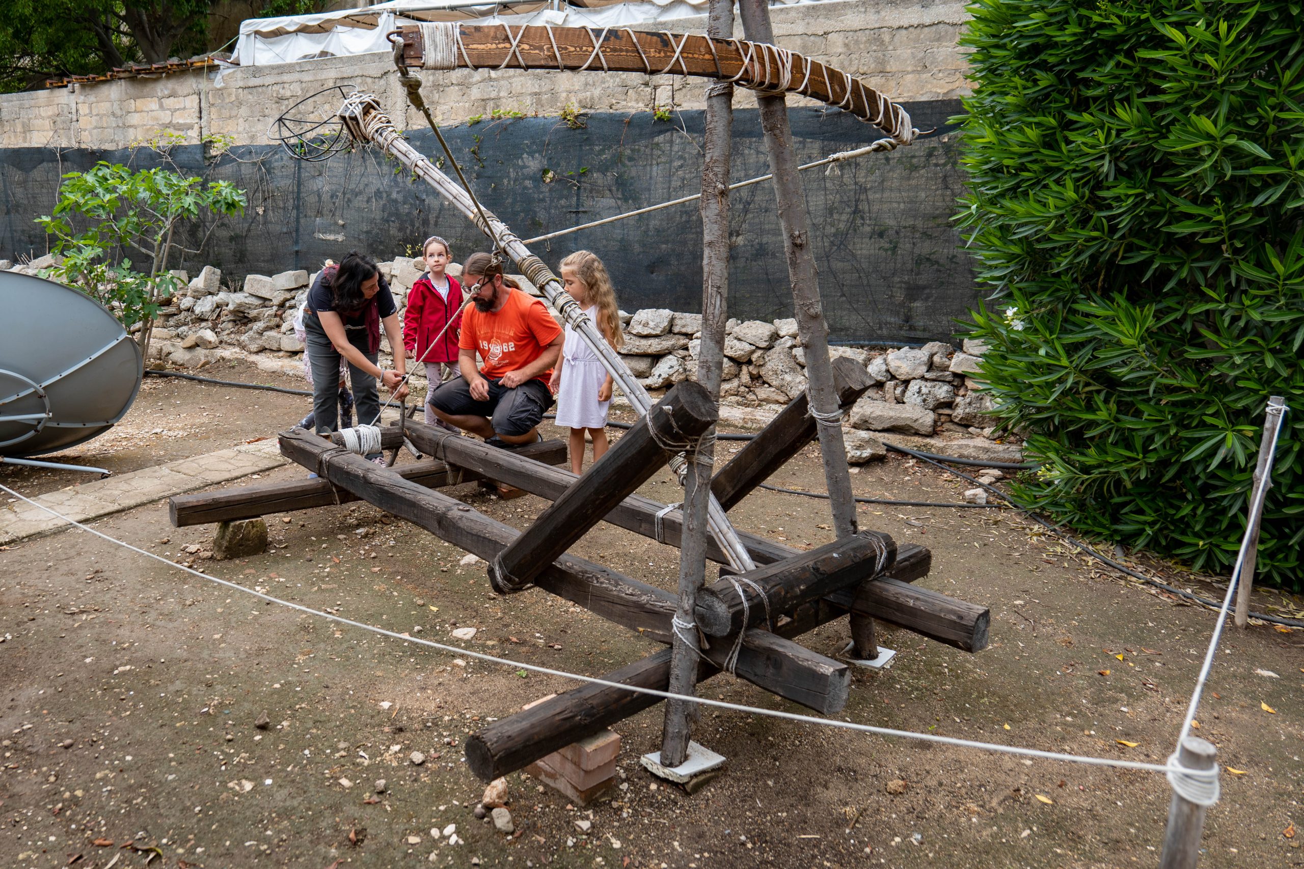 Diese Wirkungsstätte von Archimedes können wir natürlich nicht links liegen lassen wie die Cava Grande oder das Valle del Templi (was sind schon Schluchten und Tempel gegen Archiedes?), und so parken wir flugs direkt neben den antiken griechischen Theater, gleich vor einem nur Archimedes gewidmeten Freilichtmuseum. Hier treffen wir Giovanna, eine fröhliche, unheimlich engagierte Führerin, die uns mit viel Charme und Witz die 25 größten Erfindungen von Archimedes näherbringt, garniert mit einer Prise Geschichtsunterricht über das Leben und Sterben des Archimedes. Leider kommen viele der Erklärungen für Nele eigentlich ein paar Jahre zu früh, aber Hebelgesetze und den Zusammenhang zwischen Oberfläche, Volumen und Dichte kann man ja auch nicht früh genug lernen!