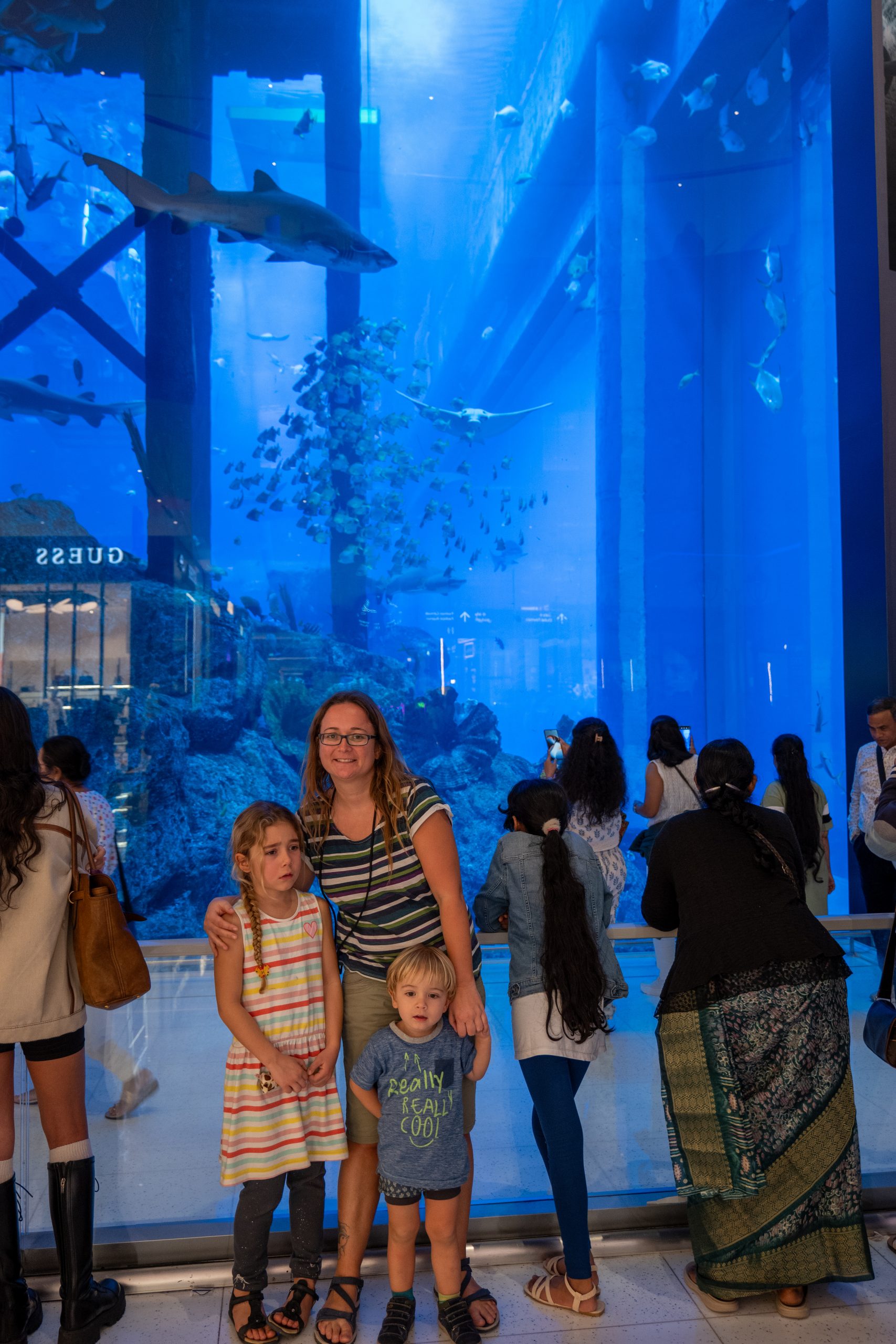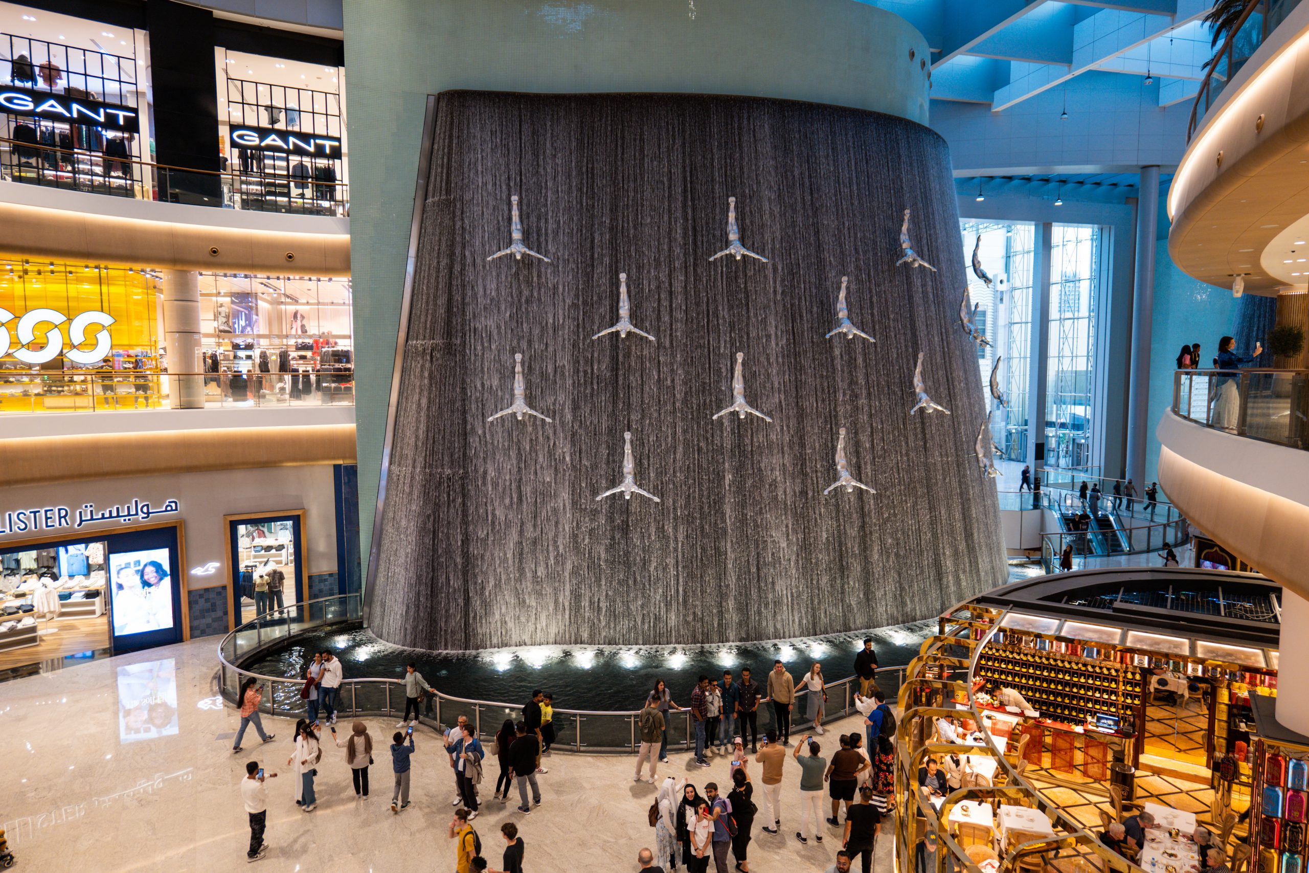 Wir beschließen den Tag mit einem Bummel durch die Dubai Mall, vorbei am Wasserfall und am Dubai Aquarium. Letzteres betrachten wir wieder nur von außen: Der Eintritt würde mit über 100€ zu Buche schlagen, und das ist es uns natürlich nicht wert. Es ist ja in Dubai schon möglich, vergleichsweise günstig auch schöne Dinge zu erleben, aber wenn man das möchte, ist man in der Mall an der wirklich falschen Adresse.