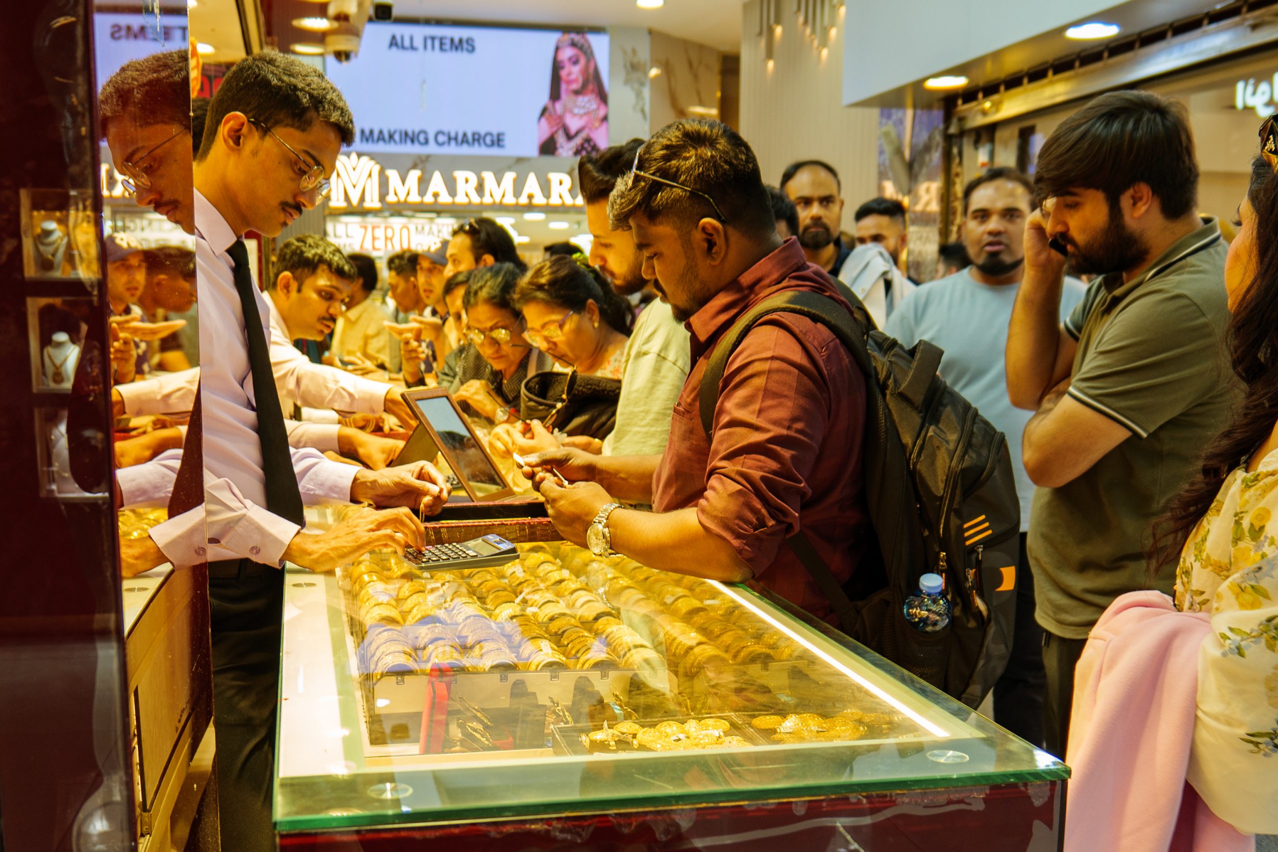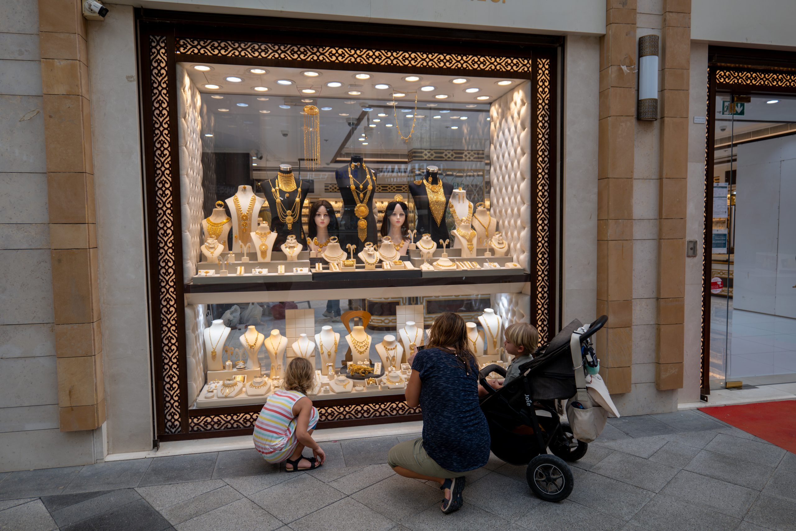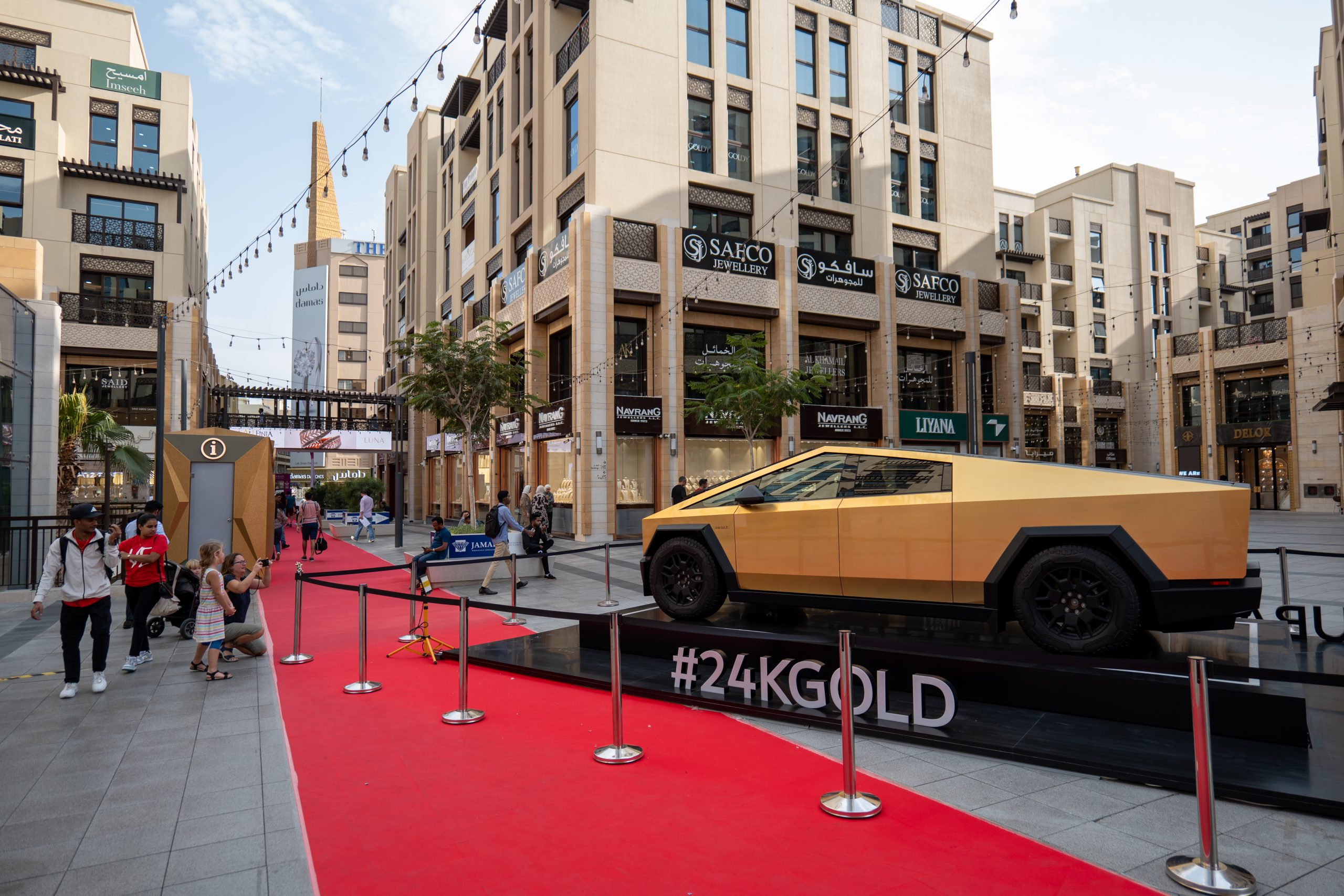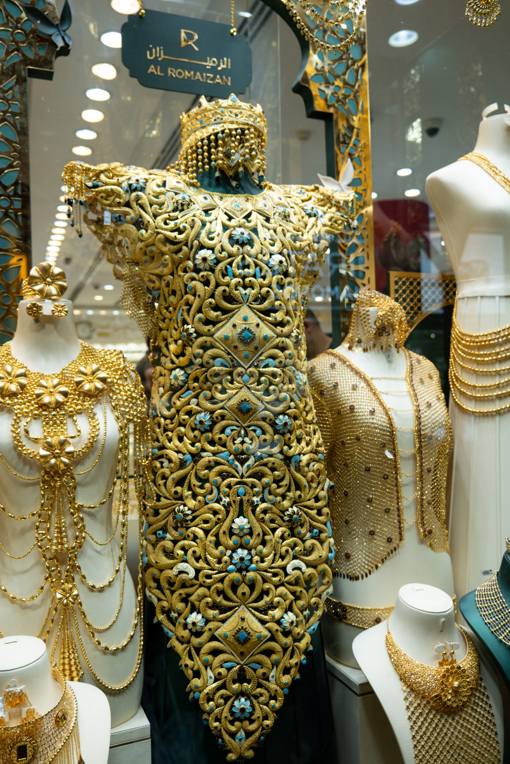 Schon wenige hundert Meter hinter unserem Hotel beginnen die Schaufenster zu funkeln, als wären sie ein Meer aus purem Licht, in dem goldene Wellen aus kunstvollen Ketten, funkelnden Armreifen und filigranen Diademen aufbrechen. Ganze Kleidungsstücke oder gar Hüte aus Edelmetall sind zu sehen, und irgendwo hier soll sich der größte Goldring der Welt befinden – sagenhafte 64 Kilogramm schwer. Dazwischen blitzt ein mit Blattgold bedeckter Tesla Cybertruck – man gönnt sich ja sonst nichts…