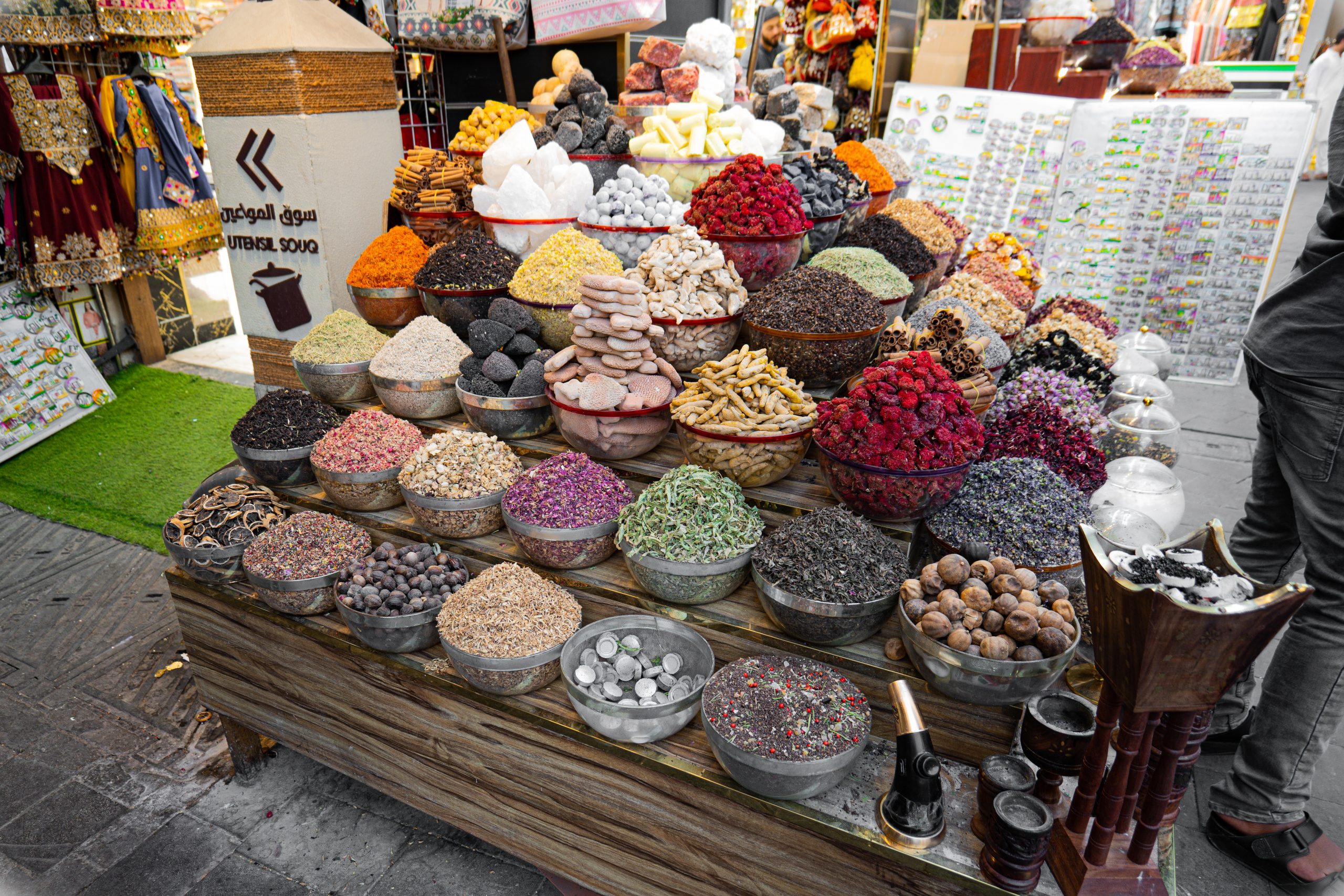 Wir verlassen den Gold-Souq in Richtung des Spice-Souq, der deutlich touristischer geprägt ist. An allen Ecken steigt der Duft von Gewürzen in die Nase, und jeder Händler versucht, uns seine Ware unter die Nase zu halten. Mit einigen unterhalten wir uns kurz, während uns Tiegel von Jasmin, Lotos, Lavendel, Lakritz, Schwefel und Alaun vorgestellt werden – immer mit dem Versprechen, dass diese Zutaten gegen oder für irgendetwas gut sein müssen!