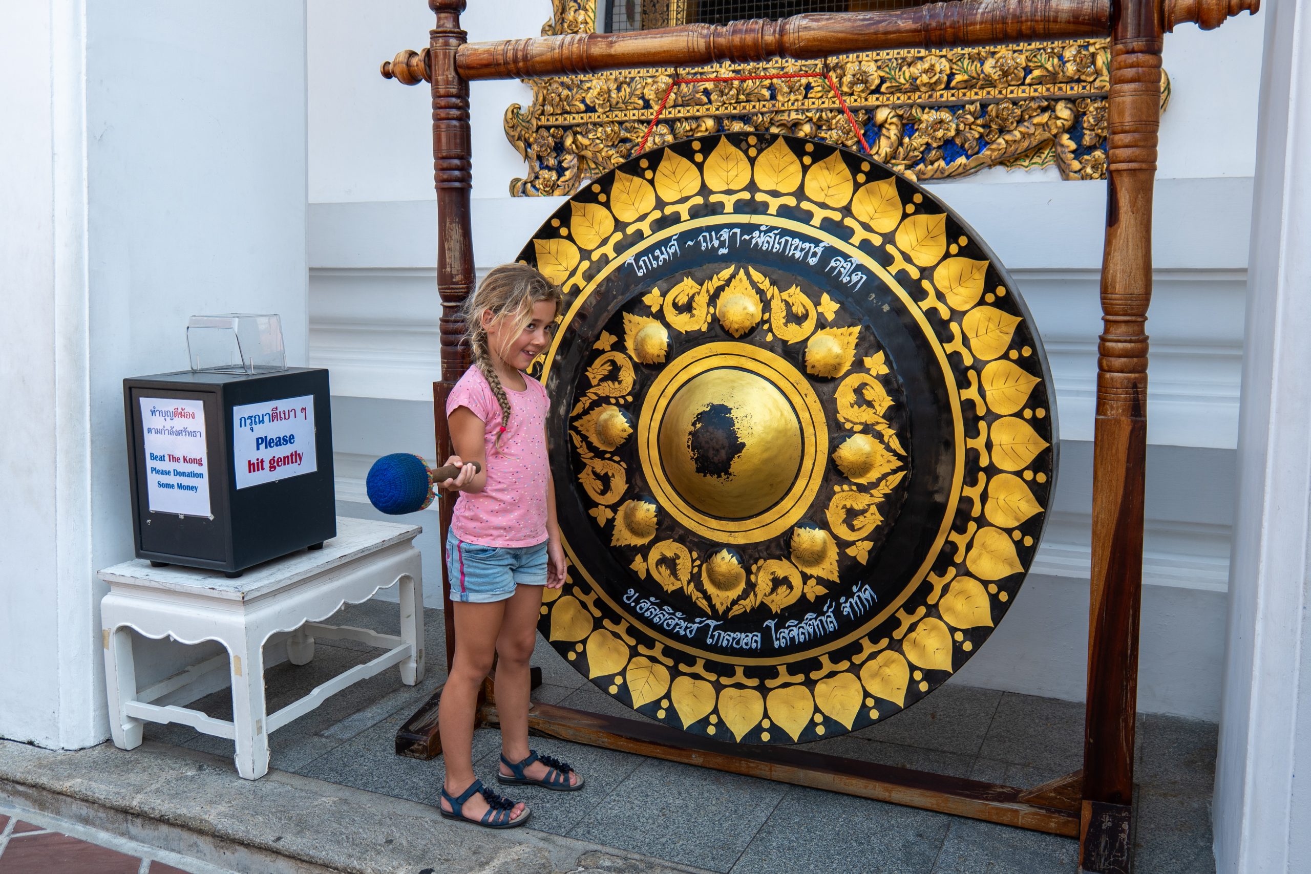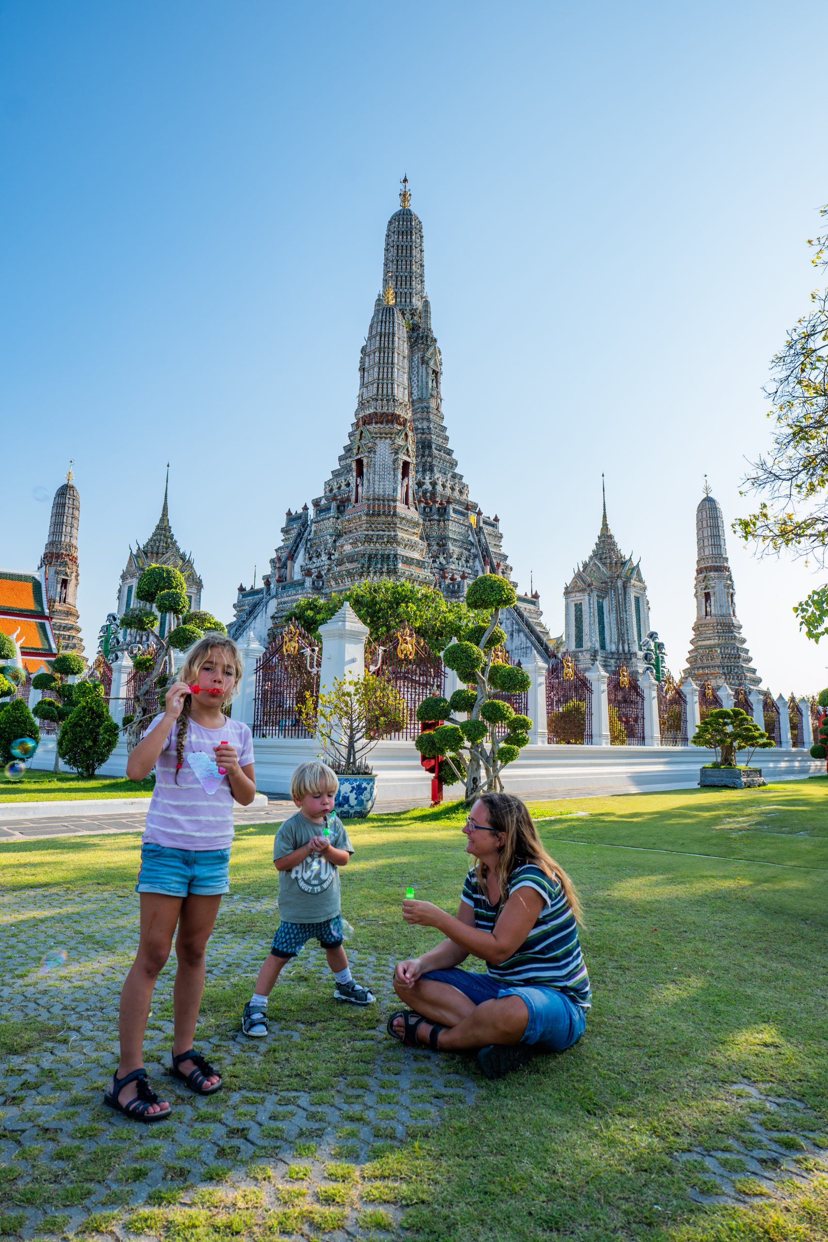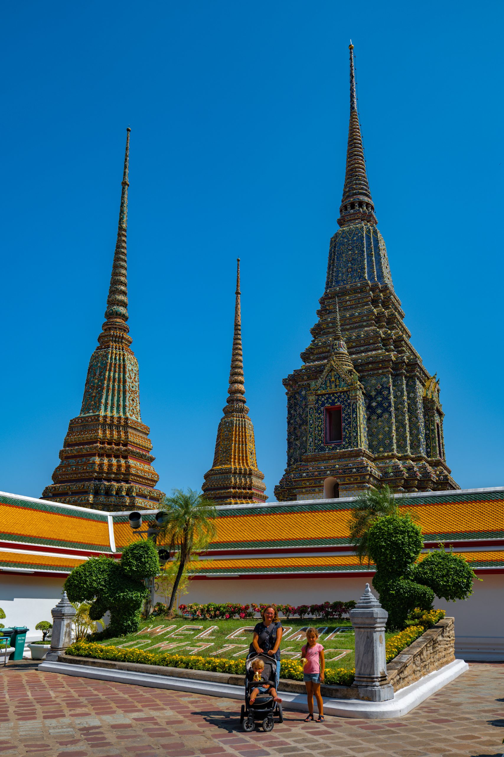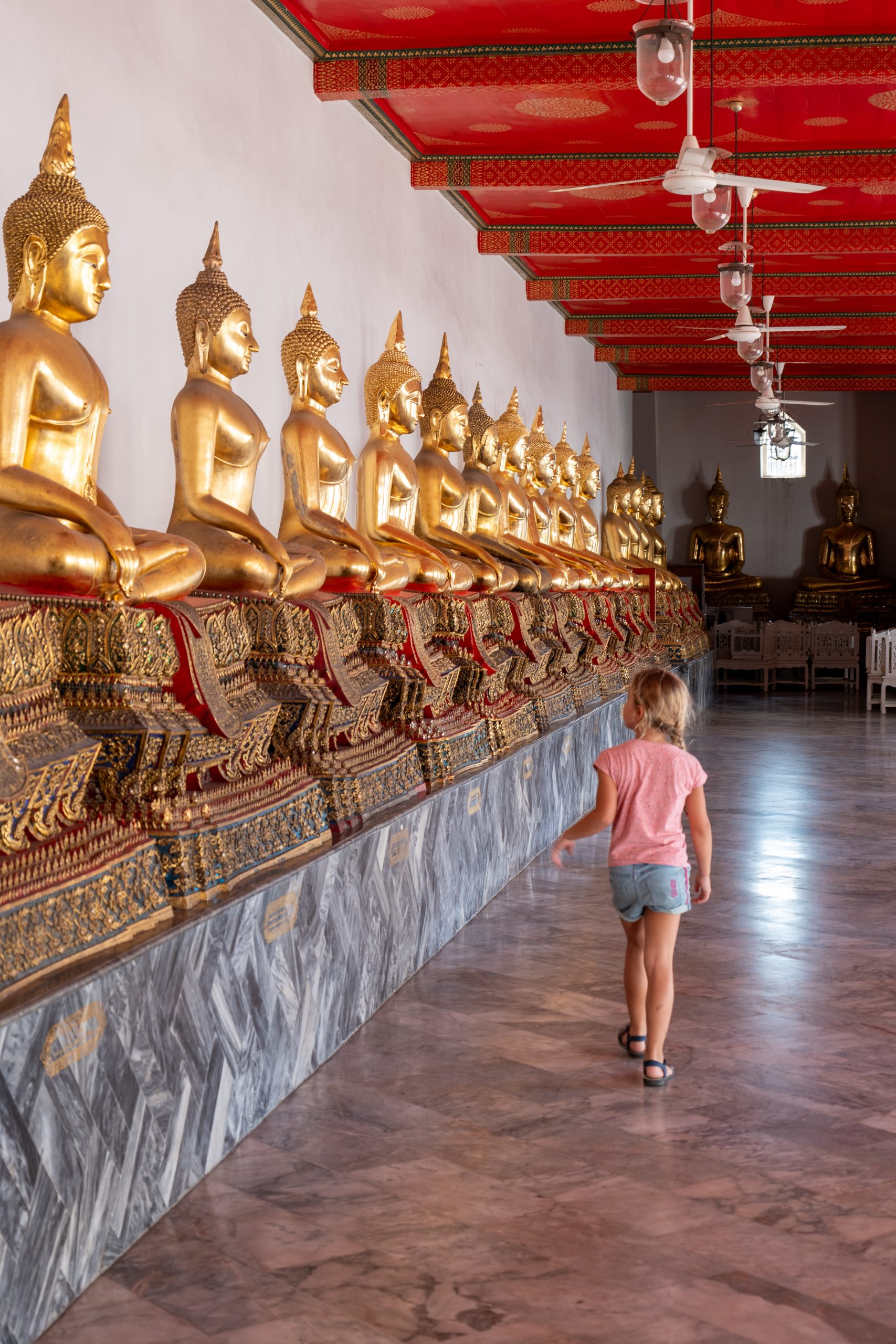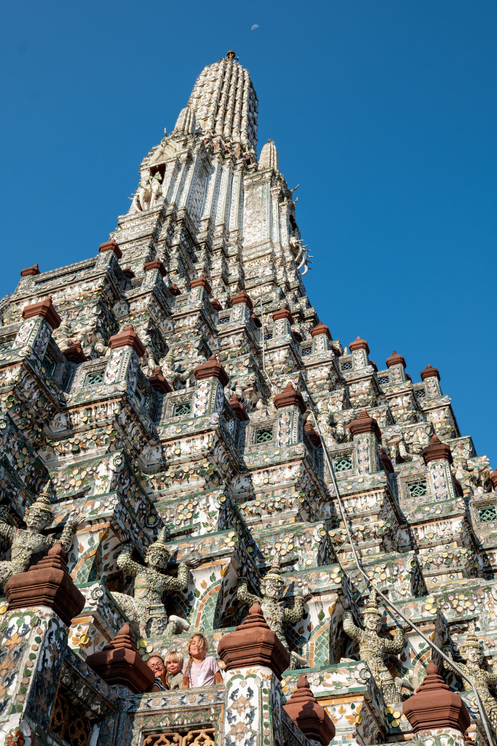 Auf der gegenüberliegenden Seite des Chao Phraya wartet mein alter Nemesis: Wat Arun. Vor zwei Jahren wollte ich diese ikonische Landmarke gern im Sonnenuntergang fotografieren – doch dann kam das „Rama-Drama“ dazwischen. Eine unauflösbare Verkehrslage zwang uns zu einem absolut unwürdigen Abschlussessen im Keller eines Shoppingzentrums, anstatt zu einem stilvollen Thai-Dinner mit Blick auf den Tempel. Diesmal jedoch haben wir die Situation fest im Griff, bewegen uns elegant mit Bussen, Tuk-Tuks und Booten durch die Stadt und haben mehr als genug Zeit für einen ausgiebigen Tempelbesuch. Besonders auffällig ist, dass hier viele Menschen in traditioneller Thai-Kleidung posieren – teils für Selfies, teils für Freunde oder Fremde, oft aber auch für professionelle Fotografen. Unsere Kinder haben derweil besonderen Spaß beim Erklimmen der steilen Stufen und bestaunen das Funkeln der unzähligen (laut Wikipedia sind es rund eine Million) glitzernden Mosaiksteinchen aus chinesischem Porzellan und Muscheln, mit denen die Prangs, die Tempeltürme, bedeckt sind.