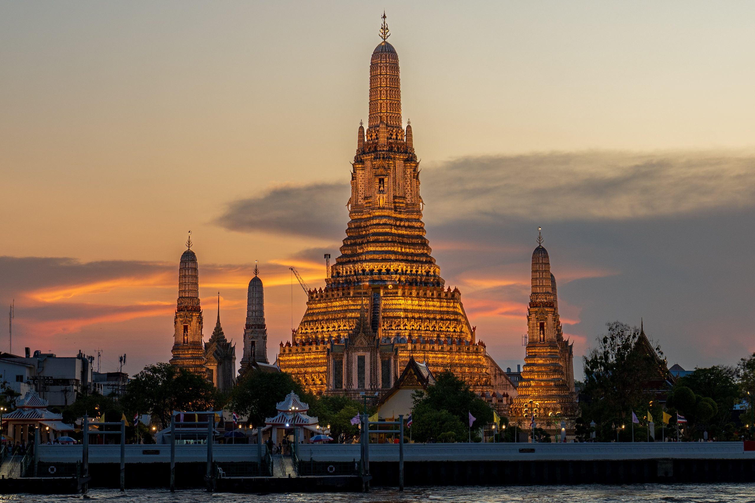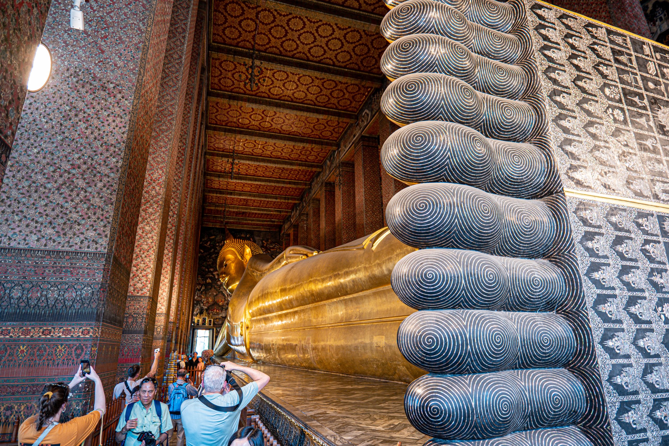 Als Erstes nehmen wir uns Wat Pho vor, einen königlichen Tempel erster Klasse mit einer ganz besonderen Attraktion: dem großen liegenden Buddha. Beim Betreten stockt uns kurz der Atem – man weiß zwar, dass die Statue beeindruckend groß ist, aber 46 Meter Länge und 15 Meter Höhe wirken in der Realität doch noch einmal anders als in der Vorstellung. Auch außerhalb des Wihan, des Klostergebäudes des liegenden Buddha, gibt es zahlreiche imposante Bauwerke zu entdecken, darunter den Ubosot – das heiligste Gebäude des Tempelensembles –, in dessen Sockel die Gebeine von Rama I. beigesetzt sind, dem Begründer der bis heute herrschenden Chakri-Dynastie.