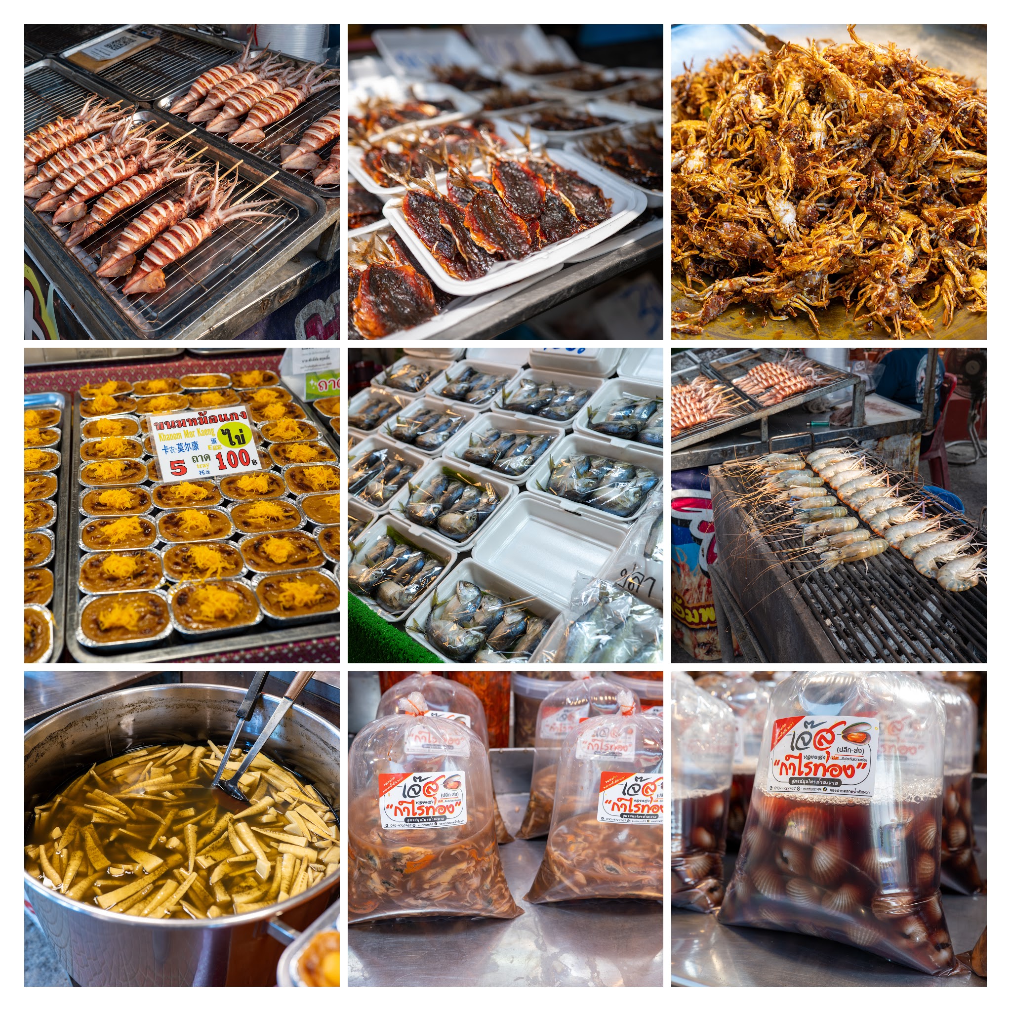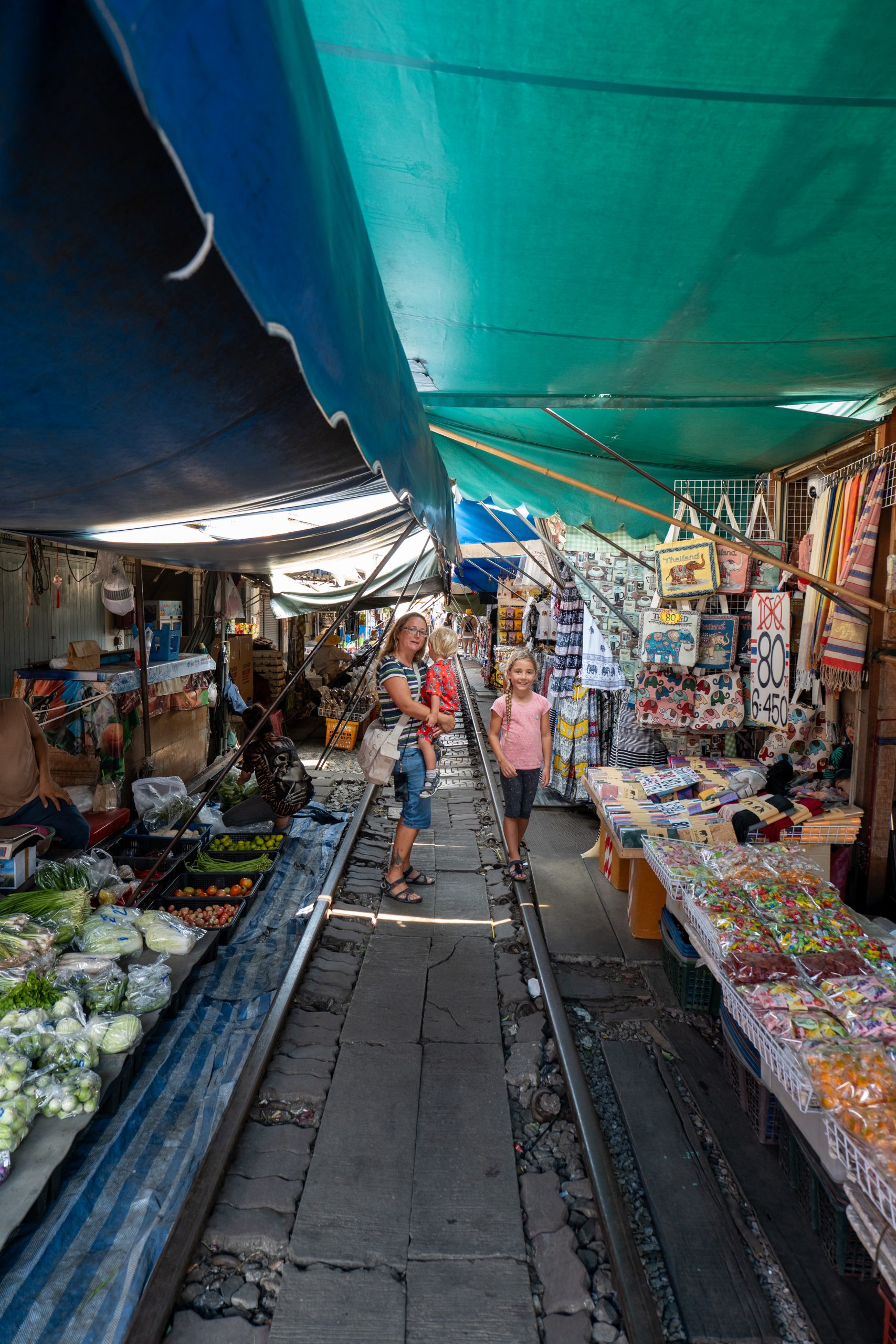 Bald erreichen wir Mae Klong, wo uns drückende, schwüle Hitze empfängt. Den Eisenbahnmarkt müssen wir nicht lange suchen, denn bereits im kleinen Sackbahnhof springen Kinder über die Gleise, während sich links und rechts der Schienen zahlreiche Essensstände aneinanderreihen. Als wir der Hauptstraße folgen, wird schnell klar, woher der Markt seinen Spitznamen hat: Die Schirme der Händler ragen so weit über die Gleise, dass sie sich in der Mitte fast berühren.