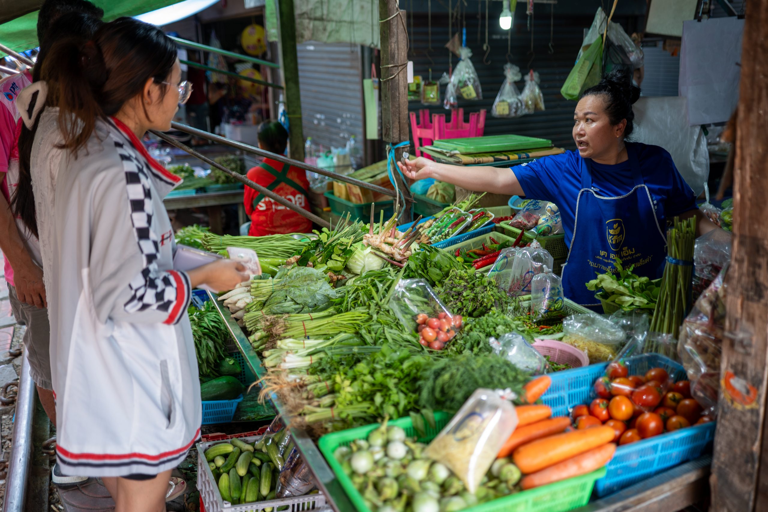 Die Atmosphäre ist wunderbar lebendig. Obwohl viele Touristen gekommen sind, um das baldige Spektakel zu beobachten, lässt sich an der Art der angebotenen Waren leicht erkennen, dass dieser Markt nicht nur für Besucher gedacht ist. Neben rohem Gemüse, Fisch, Meeresfrüchten und Gewürzen – all das, was die Einheimischen für ihren täglichen Einkauf benötigen – gibt es zwar auch Getränke und Souvenirs, doch das touristische Angebot hält sich in angenehmen Grenzen. Wir schlendern durch die engen Gassen, genießen die intensiven Gerüche und Farben und statten schließlich dem Mae Klong-Fluss einen kurzen Besuch ab. Wer ihn aus seinem Oberlauf nahe Kanchanaburi kennt, dürfte ihn vermutlich unter einem anderen Namen wiedererkennen: als „River Kwai“, berühmt durch den Film „Die Brücke am Kwai“.