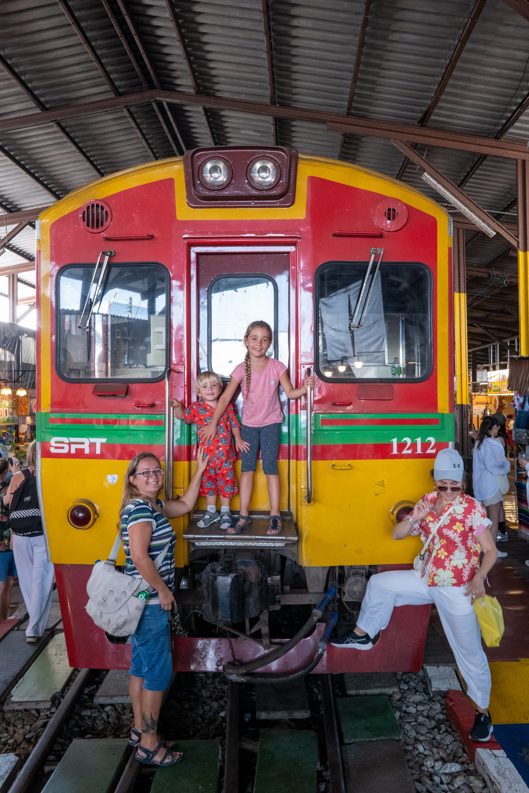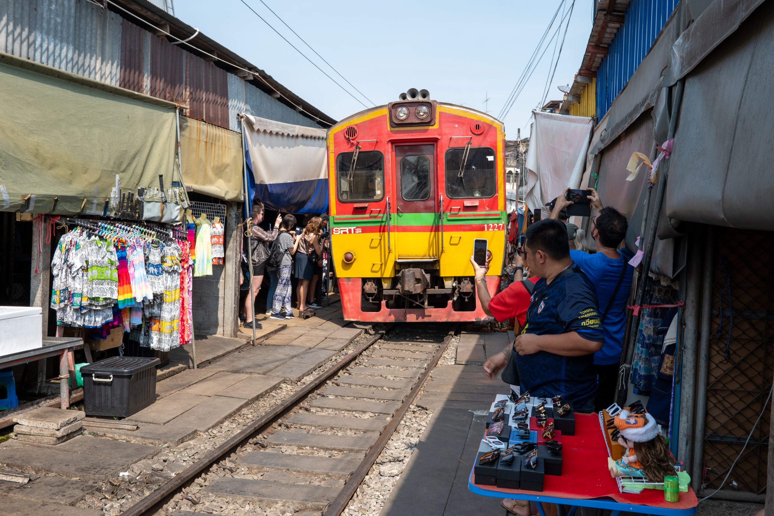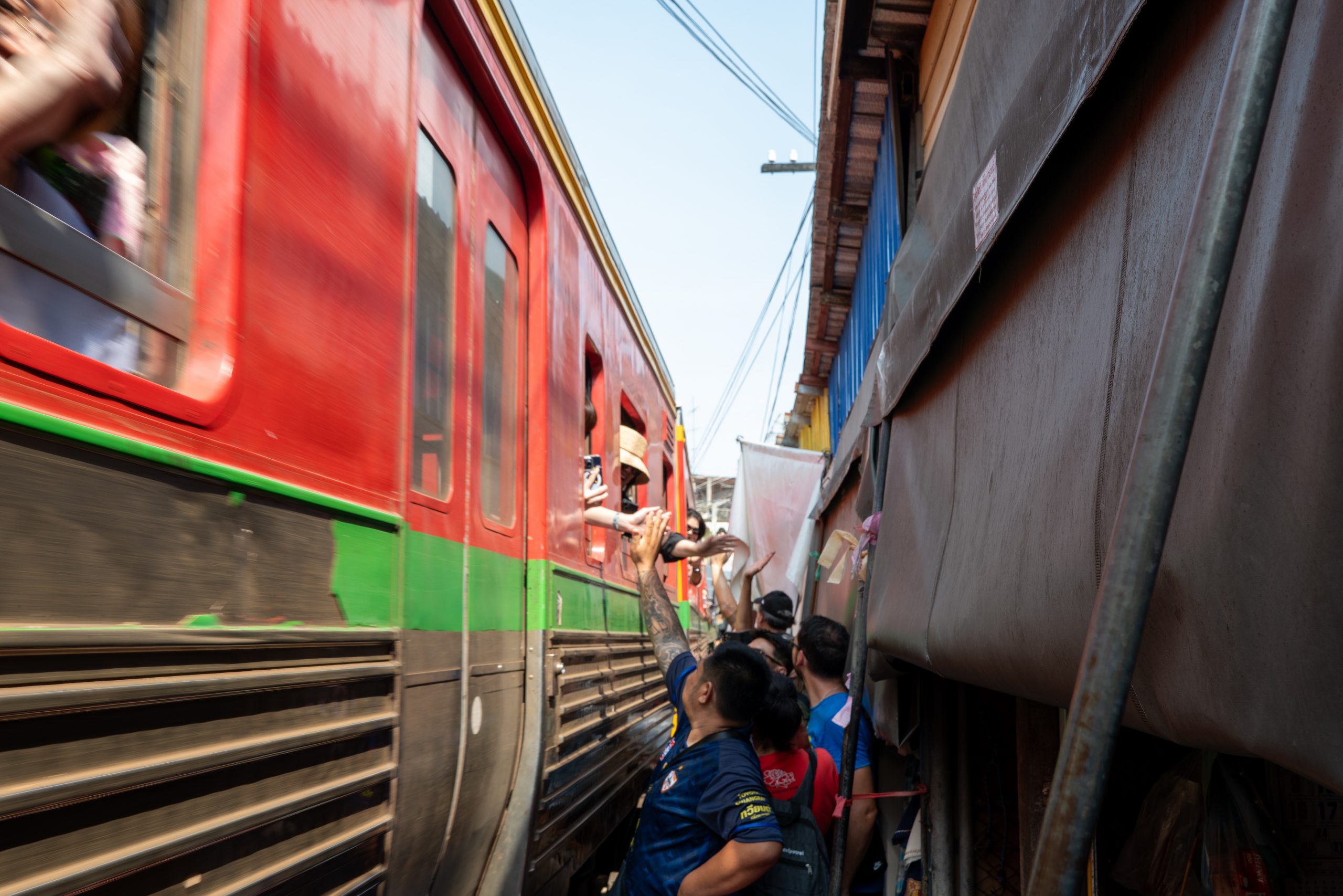 Etwa fünf Minuten bevor der Zug eintrifft, suchen wir uns ein sicheres Plätzchen, wobei wir eine schwach erkennbare rote Linie auf dem Boden als Sicherheitsmarkierung deuten. Da wir mit den Kindern unterwegs sind, wollen wir kein Risiko eingehen. Pünktlich um 14:30 Uhr erklingen aus mehreren Lautsprechern gleichzeitig Durchsagen auf Thailändisch und Englisch, die vor dem herannahenden Zug warnen. Während sich die Touristen langsam zurückziehen, beginnen auch die ersten Händler, ihre Schirme einzuklappen. Die meisten jedoch warten damit, bis die rot-gelbe Lok um die Kurve biegt und nur noch wenige Meter entfernt ist.