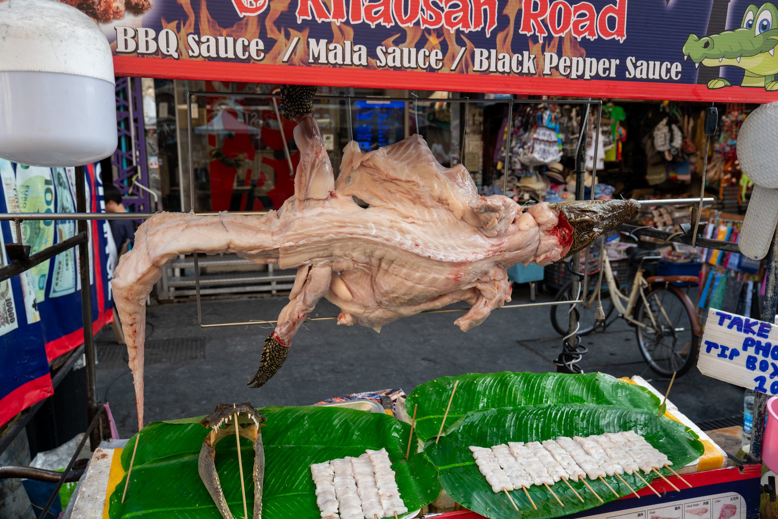 Allerdings liest man zunehmend, dass die günstigen Backpacker-Hostels nach und nach hochwertigen Hotels weichen müssen. Und ganz ehrlich: Der Tand und Trödel, der hier tagsüber verkauft wird, ist verzichtbar. Überall werden Krokodil und Skorpion am Spieß angeboten – ein Anblick, den wir in Thailand sonst kaum erlebt haben und den wir für reine Touristenfolklore halten. Kann weg. Aber gut, jetzt haben wir es gesehen. Unser zweites Tagesziel ist ohnehin wieder authentischer: Chinatown – Yaowarat.