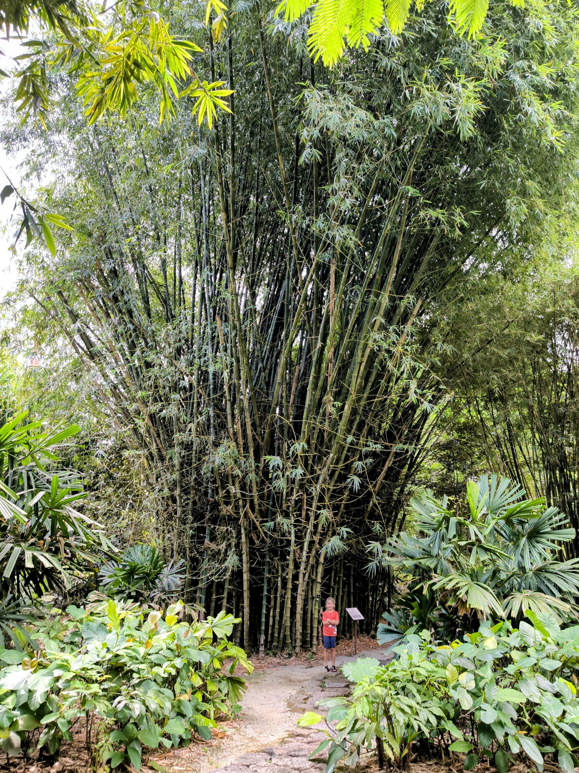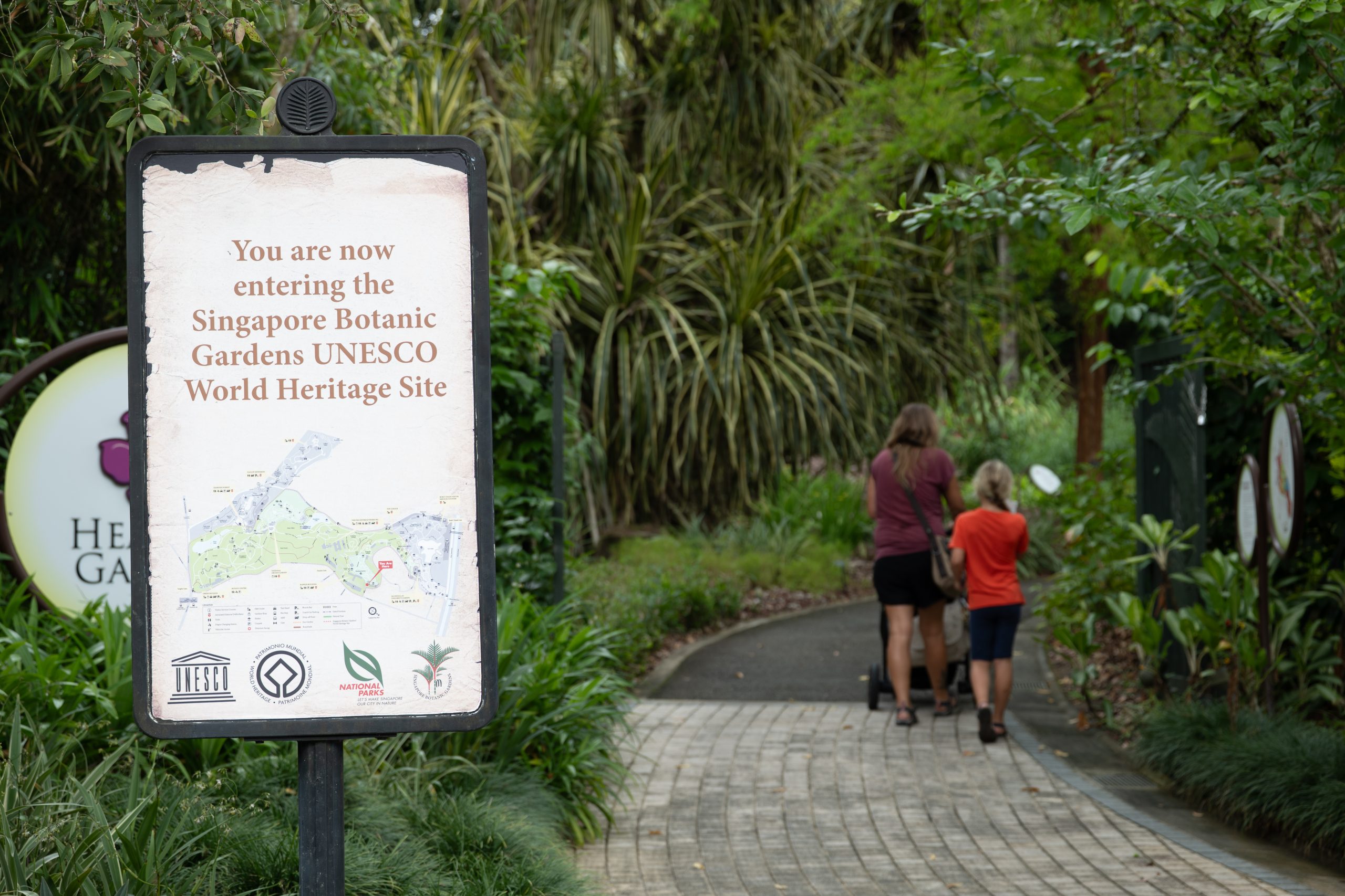 Unsere kurze Zeit in Singapur beginnen wir mit einem Ausflug in den Botanischen Garten. Dieser 1859 gegründete Park spielte eine entscheidende Rolle bei der Entwicklung der tropischen Kautschukproduktion, die die Landwirtschaft in Südostasien revolutionierte. Aufgrund seiner über 160 Jahre andauernden wissenschaftlichen und kulturellen Bedeutung wurde er 2015 in das UNESCO-Welterbe aufgenommen – und er liegt praktischerweise fußläufig von unserem Hotel entfernt! Wir beschränken uns auf den nördlichen Teil, weil hier ein Kinderspielplatz sein soll. In Asien scheinen Spielplätze seltener zu sein als bei uns, also nutzen wir jede Gelegenheit, unseren Kindern etwas Gutes zu tun.