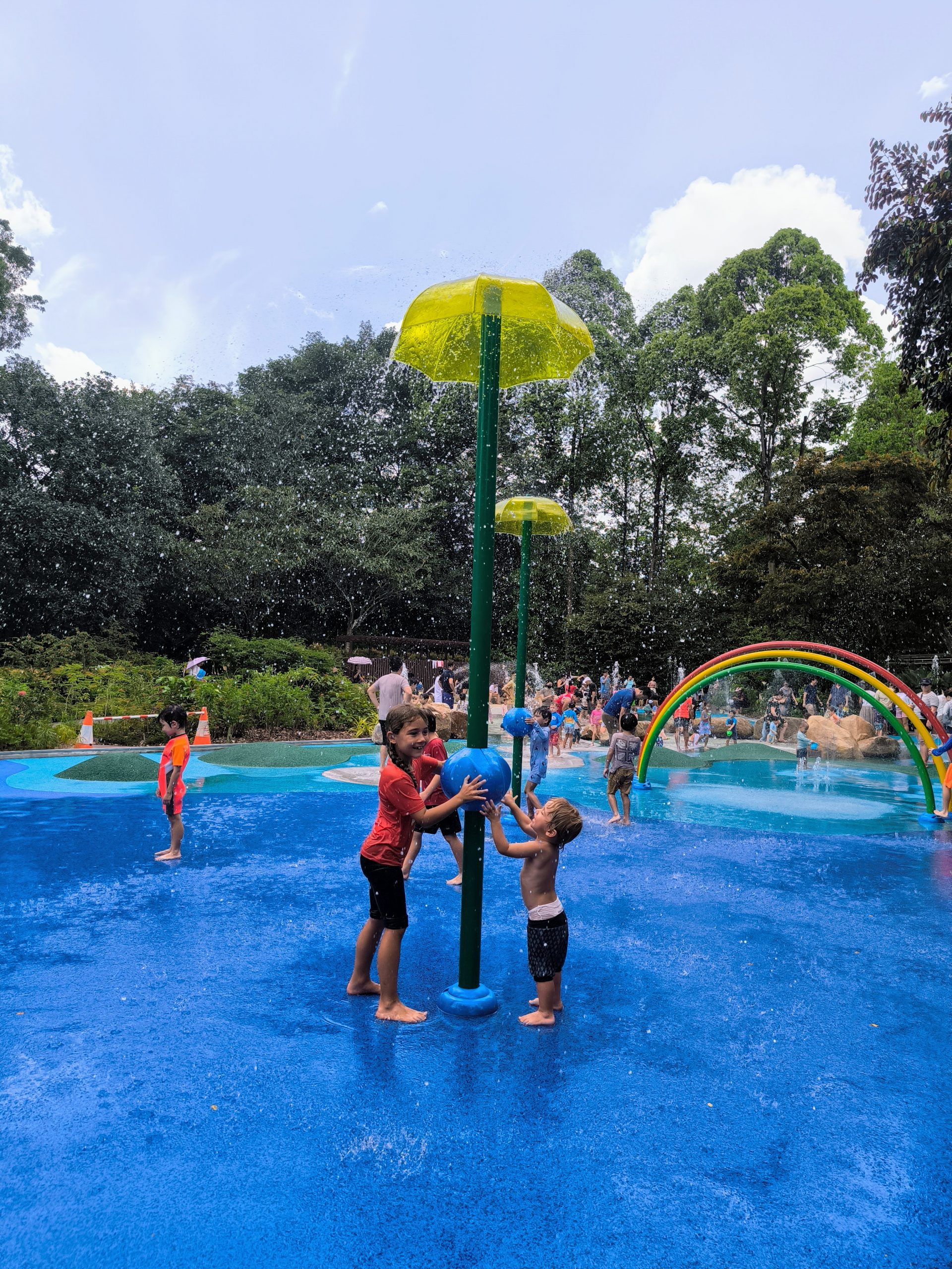 Der Spielplatz entpuppt sich, neben anderen Bereichen, als Wasserspielplatz – und obwohl wir weder Wechselkleidung noch Schwimmwindeln dabei haben, genießen die Kinder den Spaß ihres Lebens. Sie toben zusammen mit zahlreichen anderen Kindern aus aller Welt herum und rennen durch die Anlage, als hätten sie unendlich viel Energie.