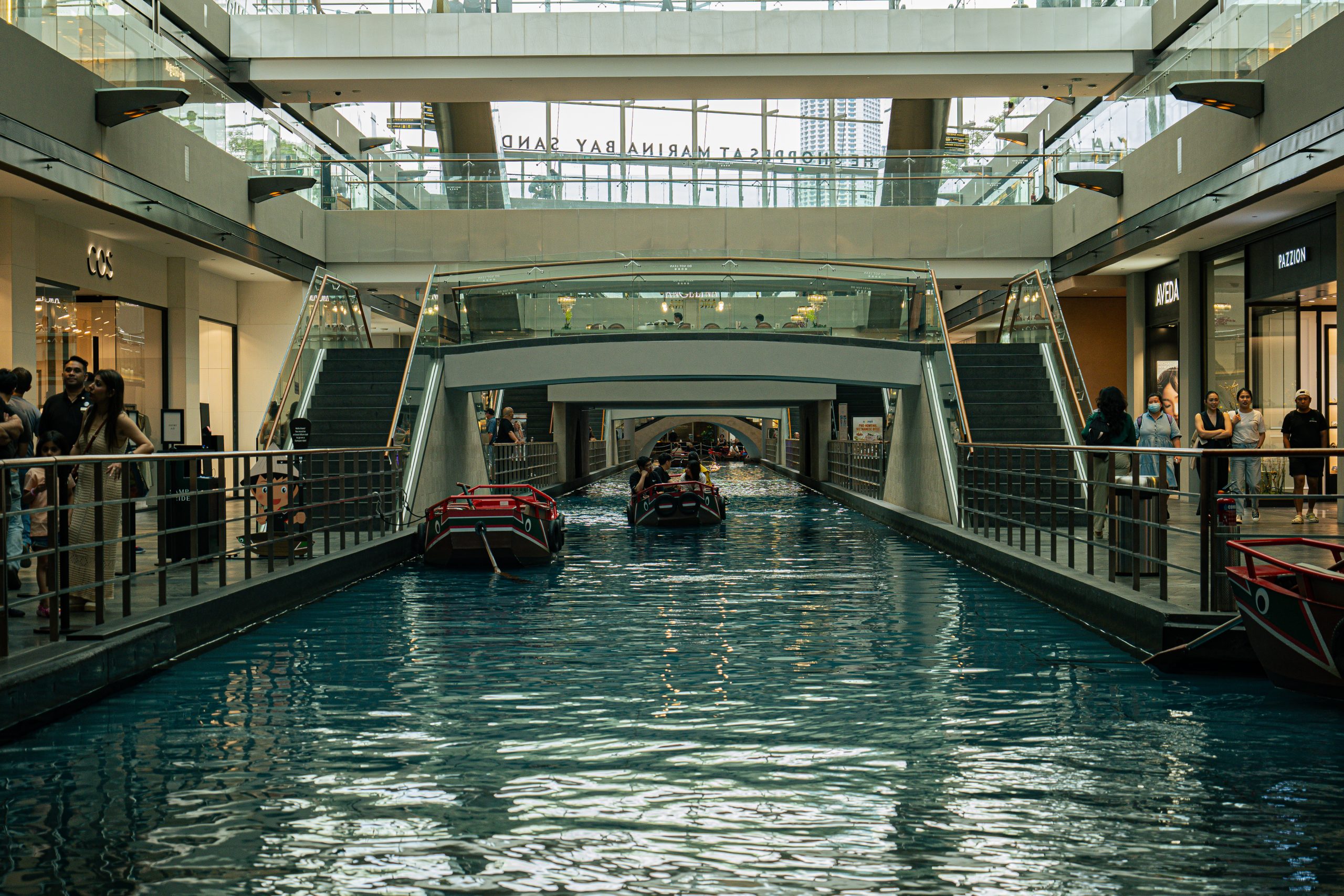 Auf dem Rückweg führt uns unser Weg in die Untergeschosse des Marina Bay Sands zur dortigen MRT-Station. Und als wir glauben, bereits alles gesehen zu haben, setzt das Einkaufszentrum dem Prunk noch die Krone auf: Ein künstlicher Kanal schlängelt sich durch das Gebäude, auf dem Sampans – die örtliche Gondel-Variante – verkehren. Schon mal von Hermès zu Gucci mit dem Boot gefahren?