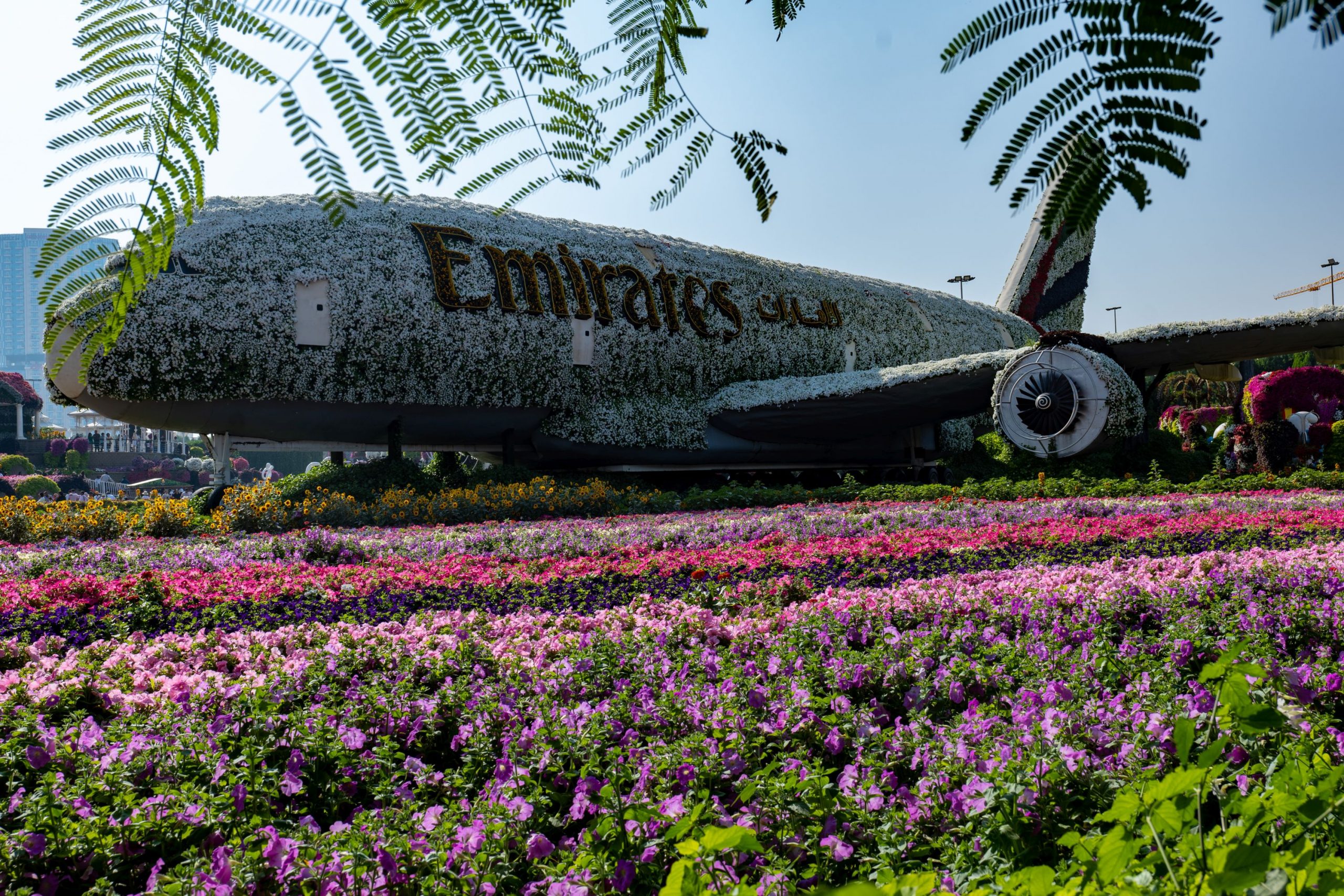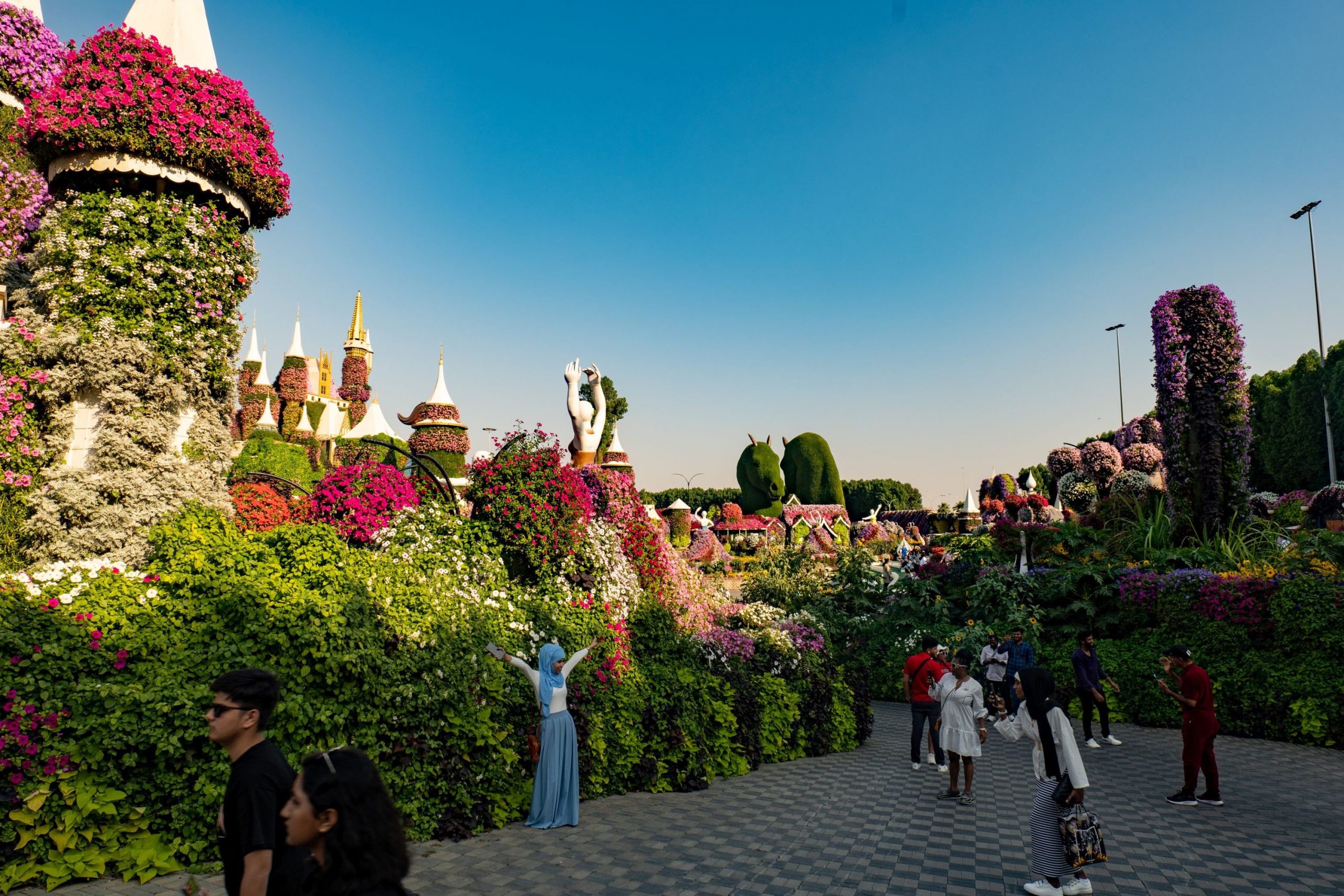 Nach den Schmetterlingen besuchen wir noch kurz den gegenüber liegenden Miracle Garden, den größten Blumengarten der Welt (was sonst!). 50 Millionen Blumen, 250 Millionen Pflanzen, größte Tierskulptur und so weiter. Irgendwann werden dann auch selbst die Superlative zur Beliebigkeit. Wir Lustwandeln ein paar Stunden, bevor wir uns zum Sonnenuntergang noch einmal aufmachen zum Burj Khalifa, wo wir uns das Wasserspiel noch einmal im Dunkeln anschauen wollen.